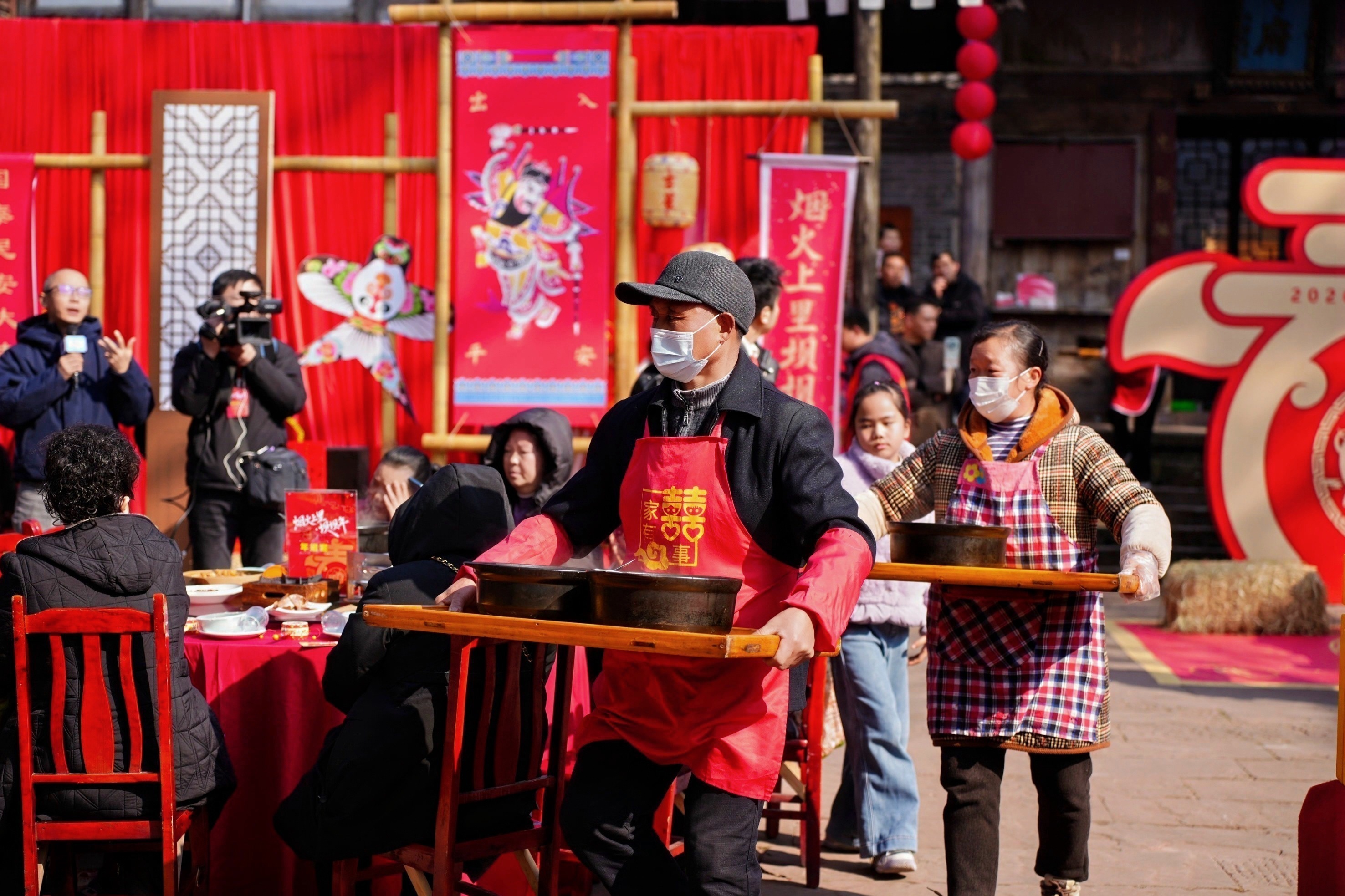 本次年猪文化系列活动打破传统模式,创新打造“四喜迎春”沉浸式互动演绎剧目——以“喜婚、喜嫁、喜宴、喜游”四大主题为核心,在四川省文化馆专业指导赋能下,推出“喜宴+年猪”剧目演绎,让游客一进入上里古镇就融入剧目当中。
