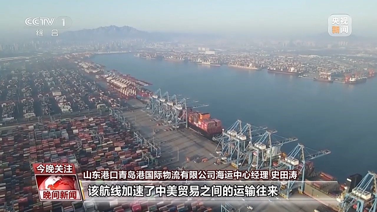 山东港口青岛港国际物流有限公司海运中心经理 史田涛:该航线加速了中美贸易之间的运输往来。将根据北美地区对中国制造的强劲需求,持续加大船舶投入密度,以满足日益增长的国际贸易运输需求。