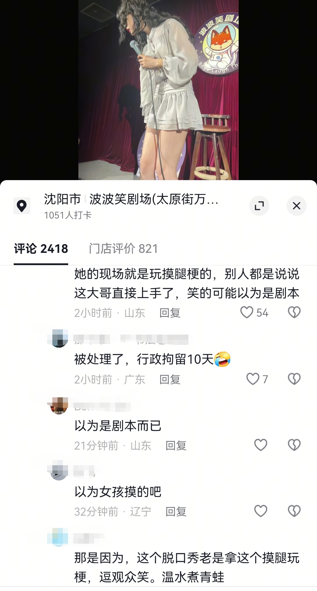 近日,沈阳市知名脱口秀剧场观众摸女演员大腿被拘留十日事件持续引发关注。5月21日,剧场所属公司工作人员接受采访时表示,女演员当天穿着正常,内容合规,剧场在事发第一时间就报警了。