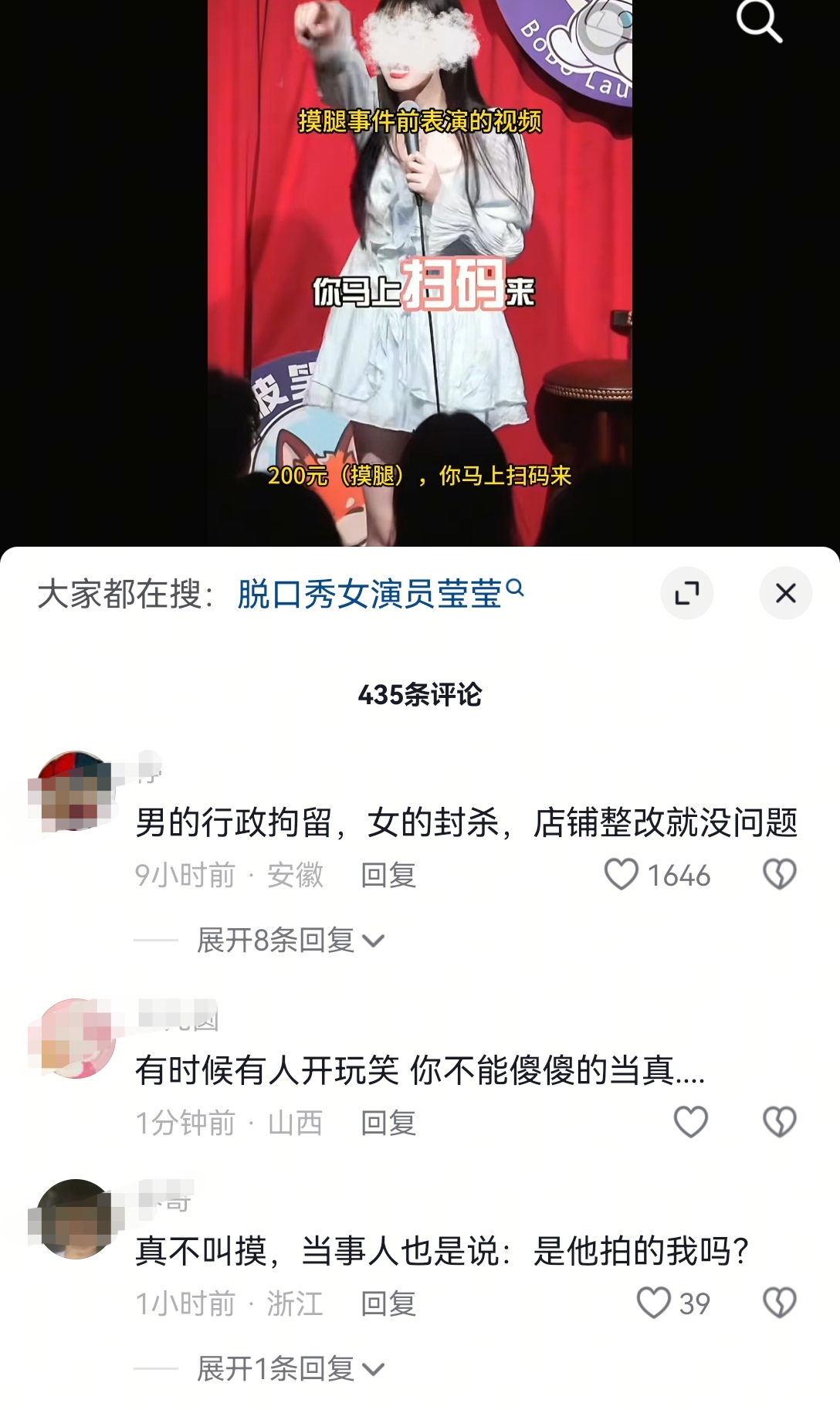 封面新闻记者注意到,该剧场及女演员以往演出视频在网上被广泛传播。有网友认为剧场“长期将摸腿作梗,几乎每场都用这个梗互动”涉嫌“擦边”。有网友建议剧场调整内容,不要再用“摸腿”玩梗、互动,以免观众误会。也有网友表示,演员开玩笑只属于“口嗨”,观众伸手则属违法。