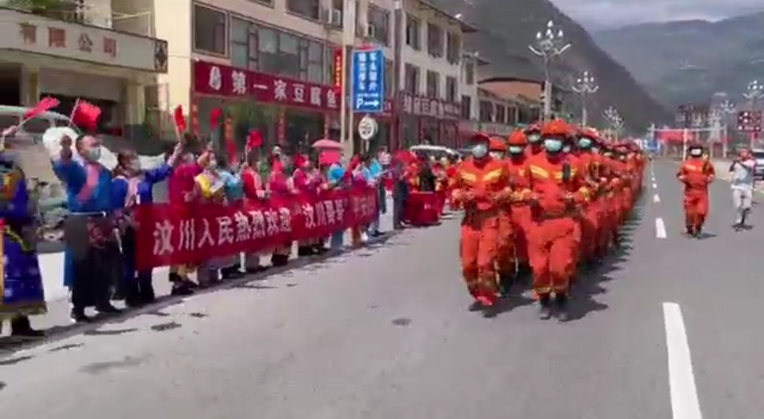 在交警的护送下,“汶川哥哥”搭乘的消防车由高速收费站进入营区。霎时间,“欢迎汶川哥哥回家”的欢呼声不绝于耳,“向‘汶川哥哥’致敬,你们辛苦了”“汶川人民热烈欢迎‘汶川哥哥’平安归来”的横幅一字排开,现场激动人心。消防员们如以往出操般昂首挺胸、整齐划一,喊着口号列队前行,臂章上的“阿坝汶川”无言地诉说着那令人难忘的一幕幕。