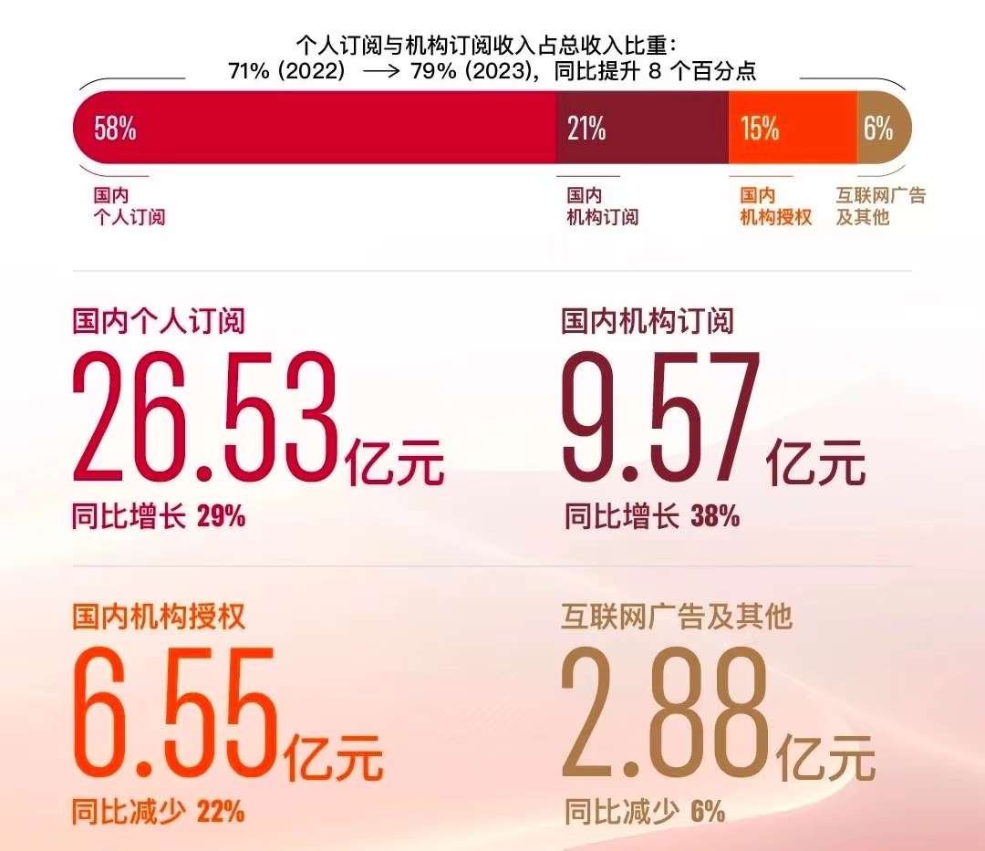 具体到各业务线,订阅业务仍然是金山办公核心的增长引擎。财报显示,该业务板块在2023年实现收入36.11亿元,在总收入中占比为79%,同比提升8个百分点。其中,国内个人办公服务订阅业务实现收入26.53亿元,同比增长29.42%,累计年度付费个人用户同比增长18.43%至3549万;国内机构订阅及服务业务收入9.57亿元,同比增长38.36%。