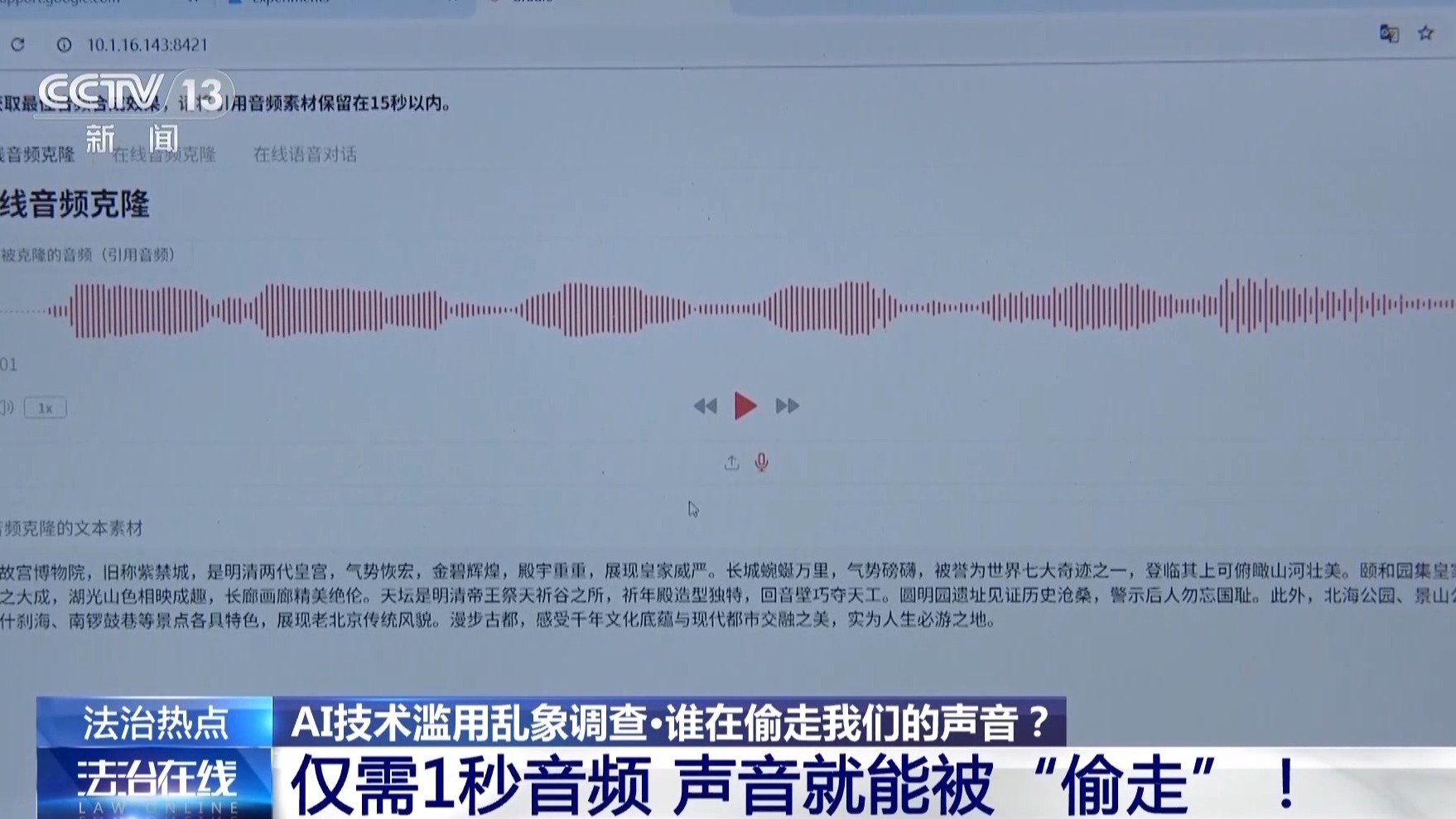 网络安全专家随意截取了其中1秒钟音频作为克隆样本,仅仅几秒钟后,记者的克隆声音就朗读出了一段从未录制过的文字。