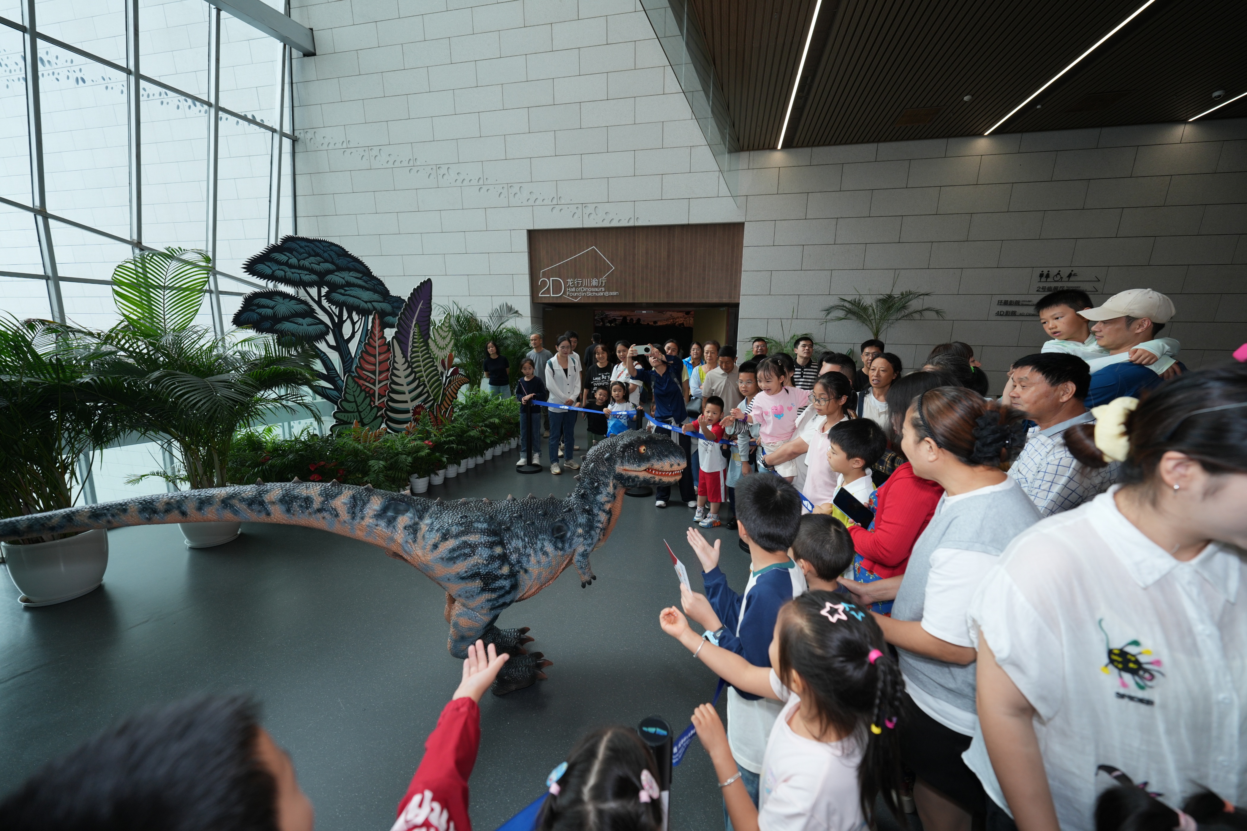 再将视线一转,循着孩子们惊喜的欢呼声望去,一只智能仿生恐龙正上下摇摆着长长的尾巴。原来,这只高1.4米的“史前巨兽”不仅能够自如转动头部、摆动尾巴,还会眨动眼睛发出低沉的吼叫声。逼真的动作让在场观众啧啧称奇,与展厅内的恐龙化石相映成趣,构成一幅跨越亿万年时空的生动画面。