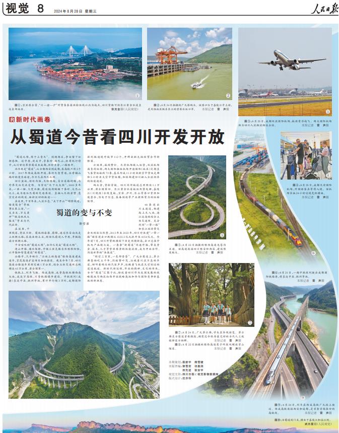 “衔空三百里,一色郁青苍”。广元古蜀道上,翠云廊苍柏屹立千年,仍枝繁叶茂,注视着川流不息的车道,倾听着码头的汽笛声声,远眺着飞机在天空划过的道道航迹。新时代新征程,开放的精神、文化的传承,古今“蜀道”汇聚于此,绘就着四川作为我国发展的战略腹地与构筑向西开放战略高地和参与国际竞争新基地的新画卷。
