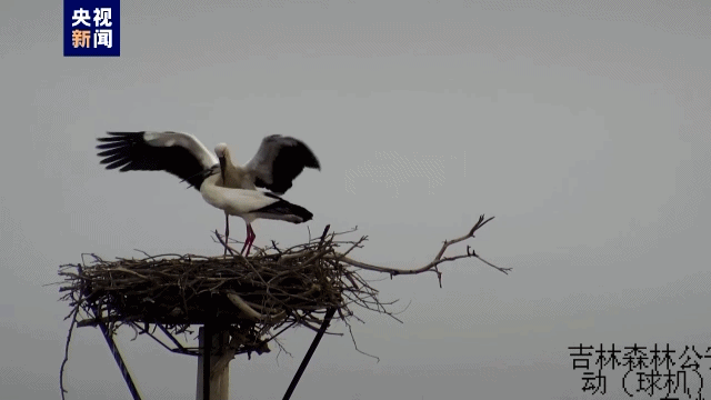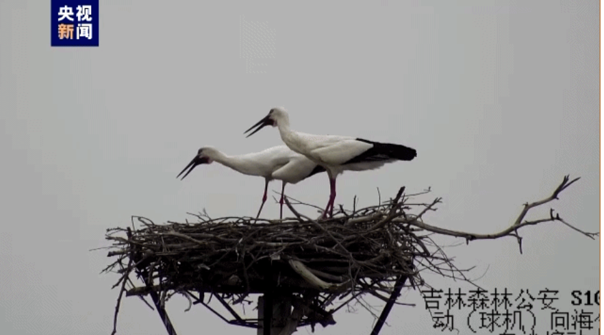架设在人工巢旁边的摄像头清晰地拍摄下一雌一雄两只东方白鹳交配、嬉戏的画面,两只大鸟时而安静驻足,时而仰起脖颈、嘴角朝向天空发出求爱信号。