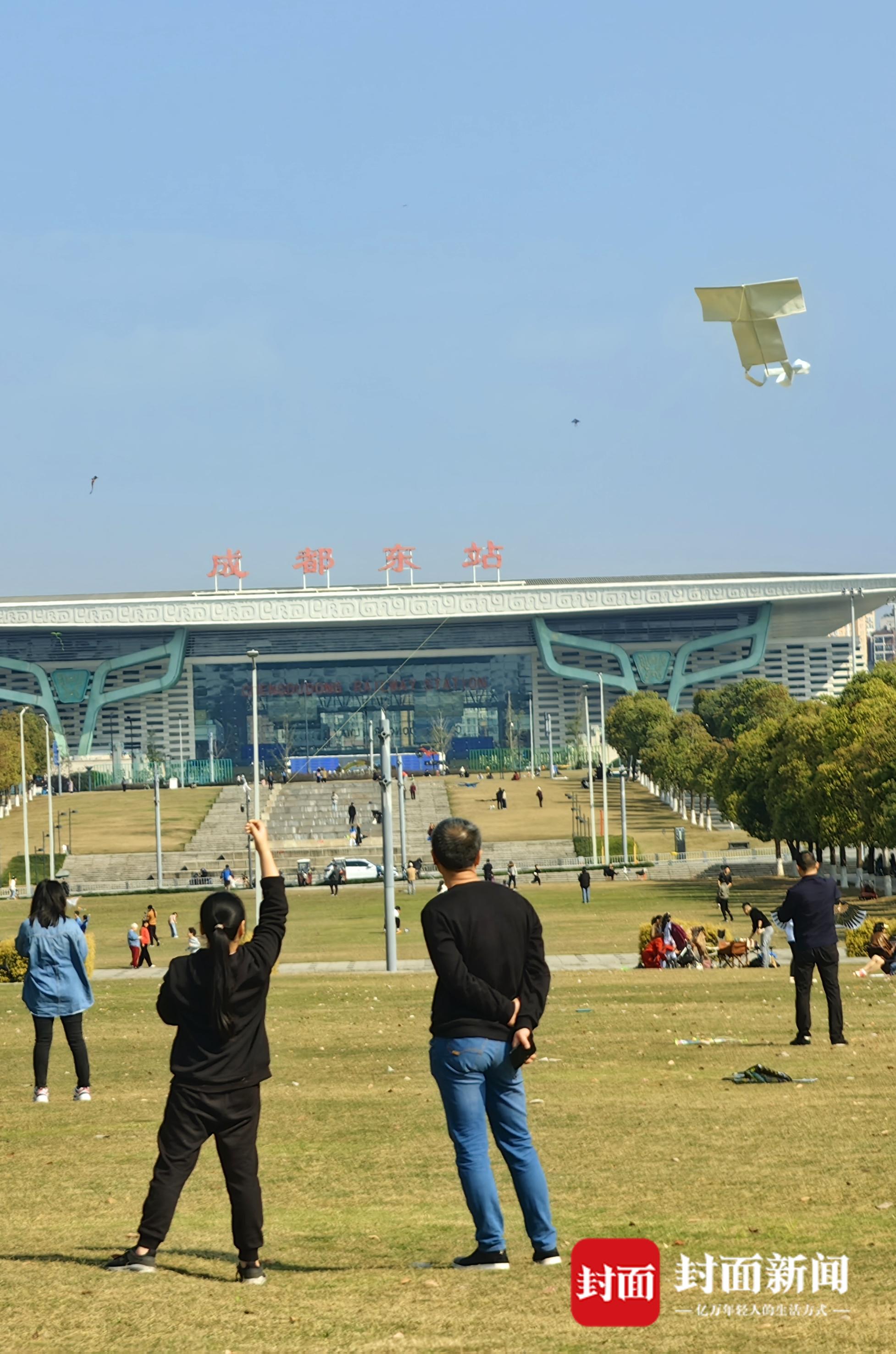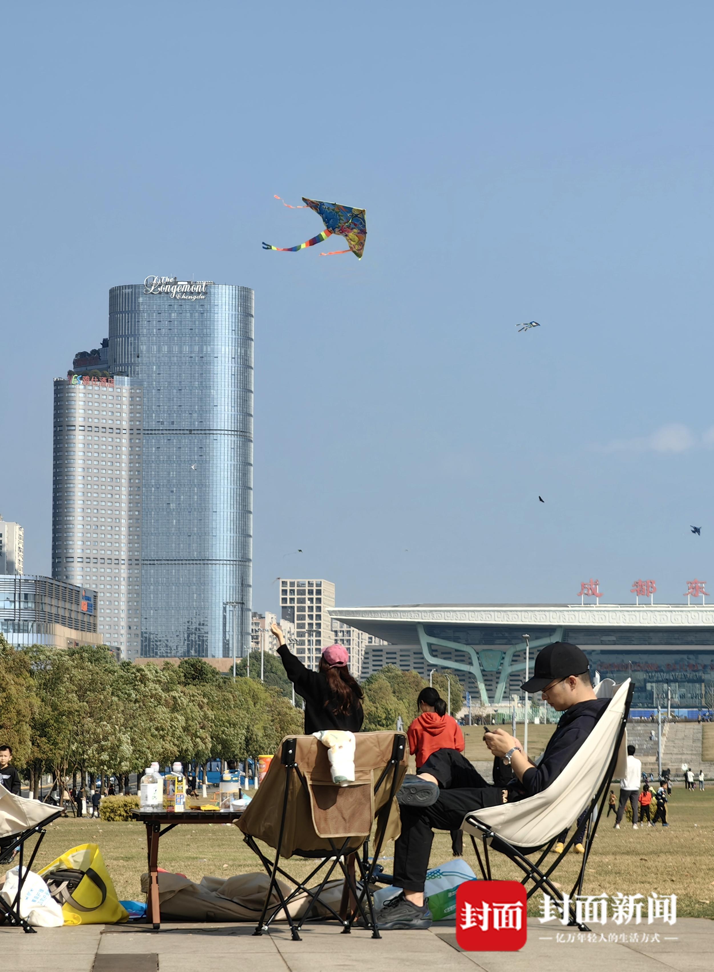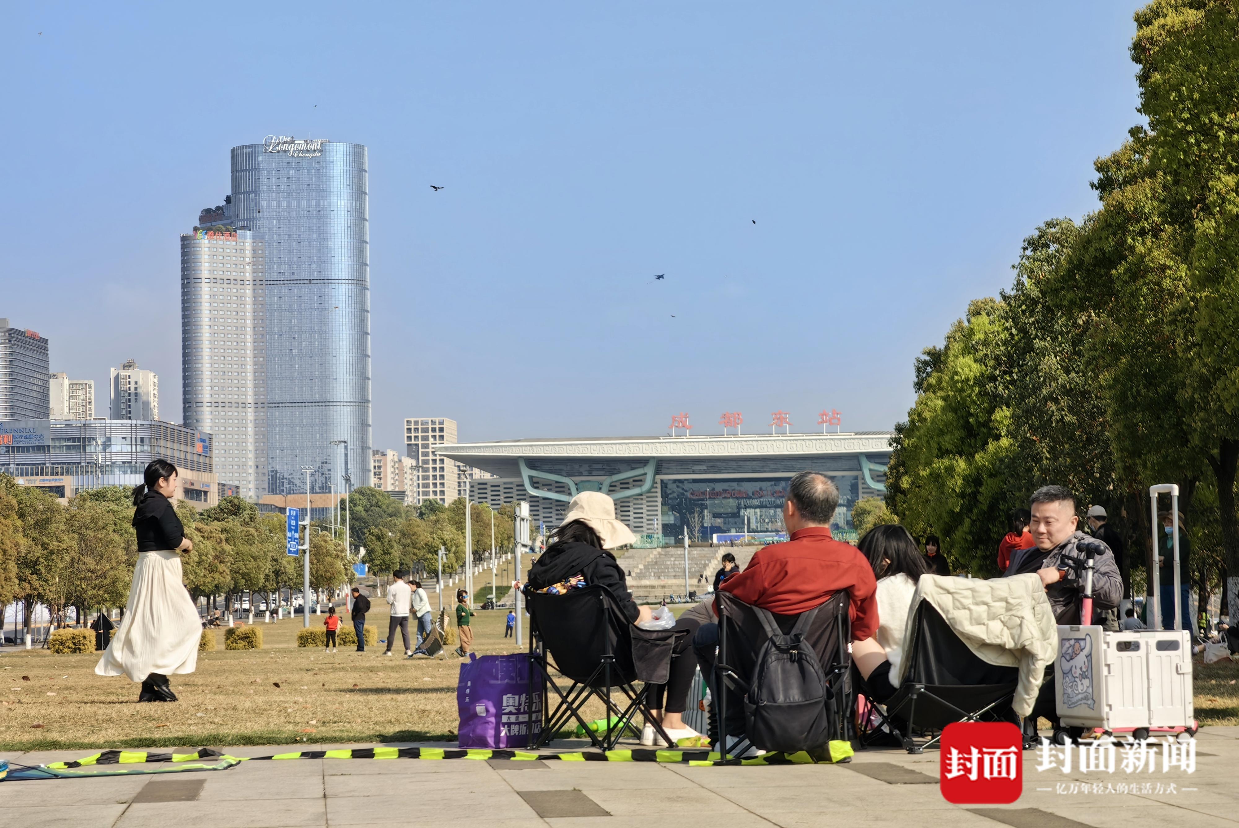 众多市民在成都东站西广场的空地上“安营扎寨”,带上户外用品,摆起椅子桌子,一家人喝茶聊天。
