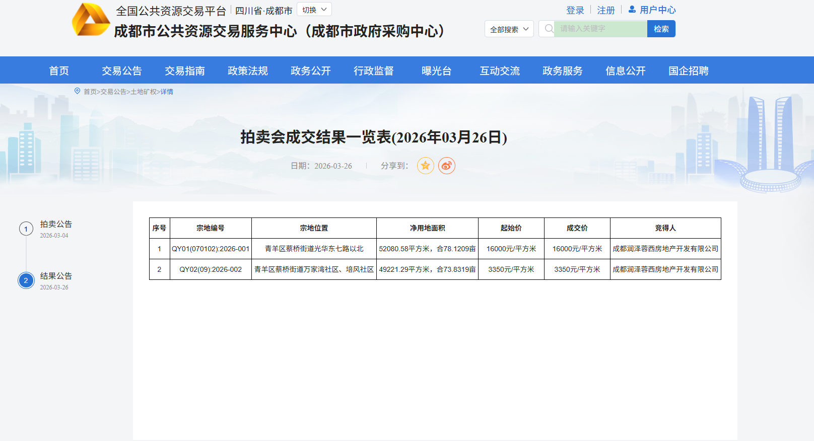 3月26日,成都市公共资源交易服务中心网站显示,华润置地(成都)有限公司旗下的成都润泽蓉西房地产开发有限公司,成功摘得青羊区蔡桥街道约152亩商业+住宅用地。