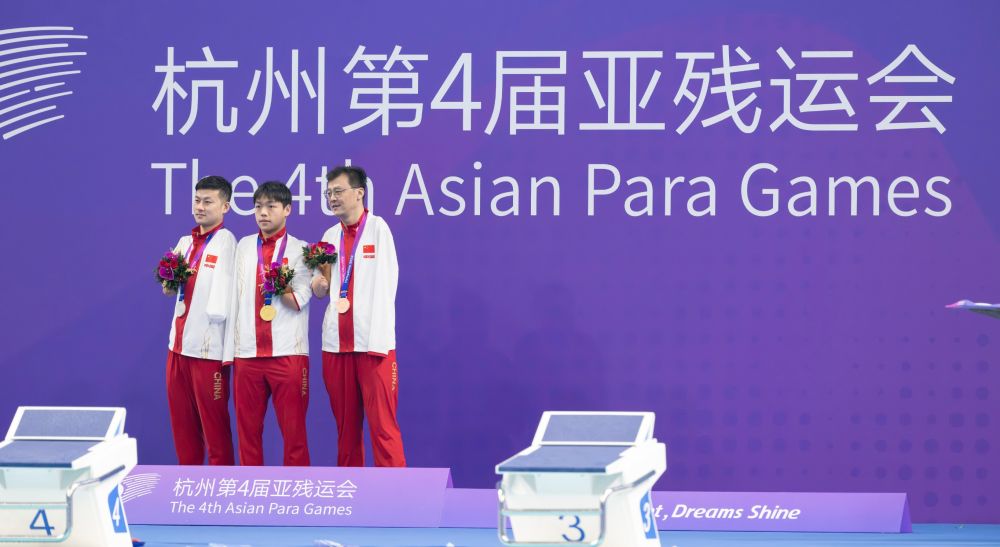 10月25日,冠军中国选手杨洪(中)、亚军王金刚(左)和季军贾红光(右)在男子200米个人混合泳-SM6级颁奖典礼上。新华社记者才扬摄