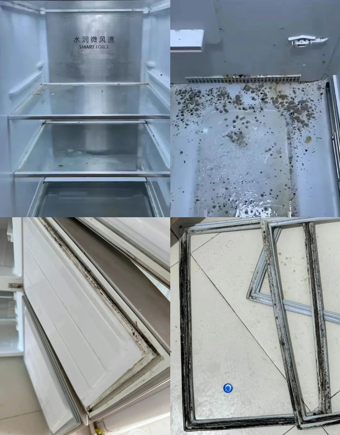 除冰箱架子、蔬菜篮、门封条等常规位置,蛋架和排水孔的卫生状况也让人担忧。