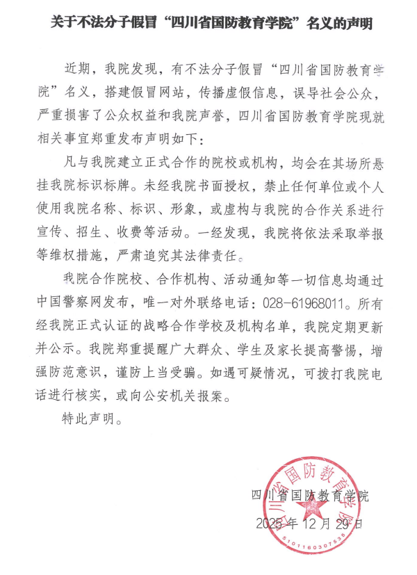 关于不法分子假冒“四川省国防教育学院”名义的声明