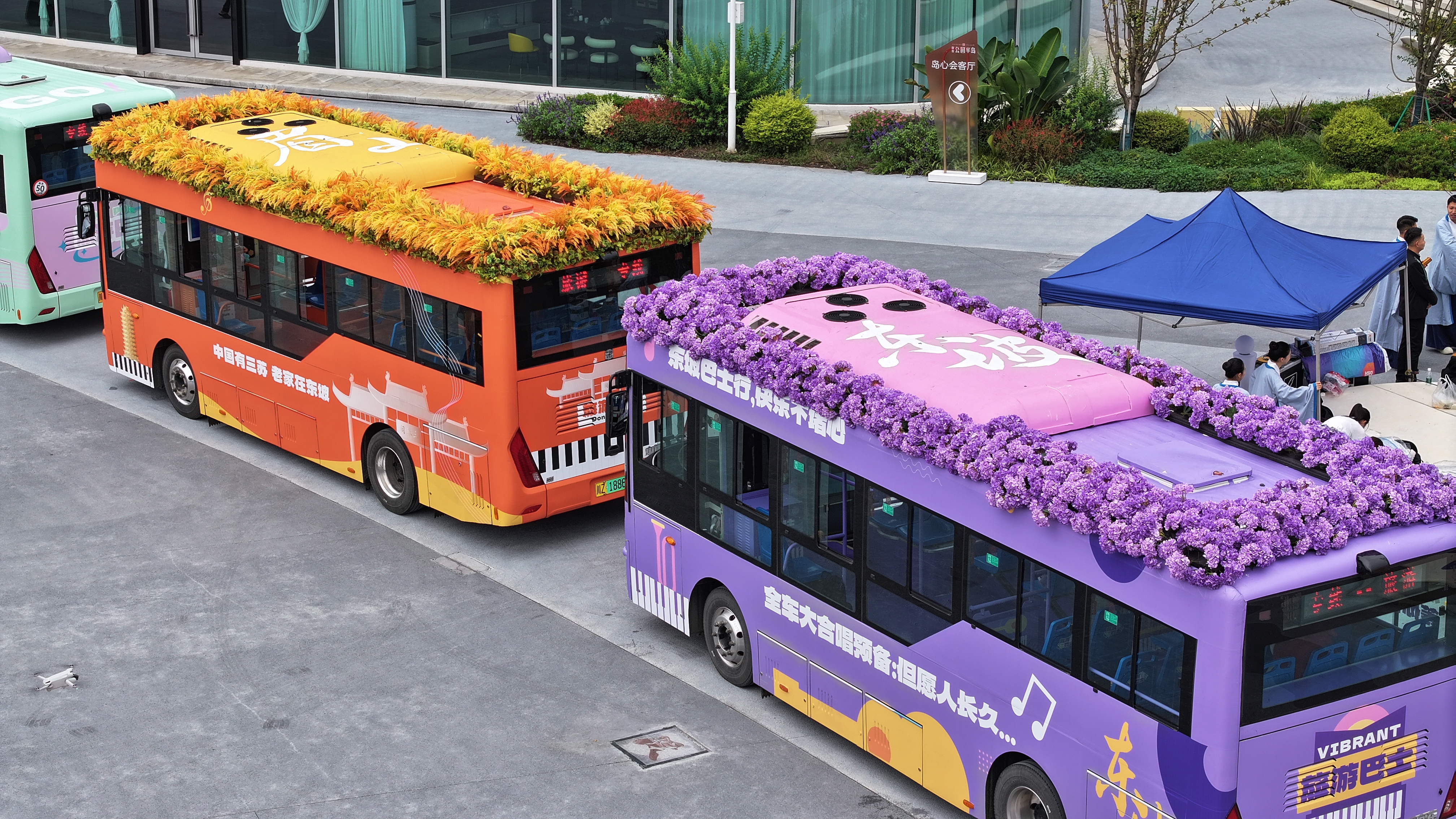 6 辆主题巴士各具风情。“文脉寻踪号”绘有巍峨的远景楼与清幽的三苏祠,“浪漫交响号”车身被温柔的蓝花楹花海包裹,“味蕾风暴号”印满东坡肘子、东坡大米等美食符号,而“少年东坡号”因贴近亲子文化需求,更成为家庭游客的新宠。