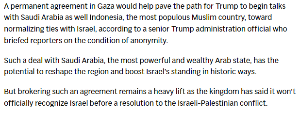 美联社援引一位不愿透露姓名的美国政府高级官员的话说,加沙永久和平协议将有助于为特朗普与沙特阿拉伯以及人口最多的穆斯林国家印度尼西亚展开谈判铺平道路,以实现这些国家与以色列关系的正常化。如果能与沙特阿拉伯达成协议,则有可能重塑中东地区格局,以历史性的方式提升以色列的地位。