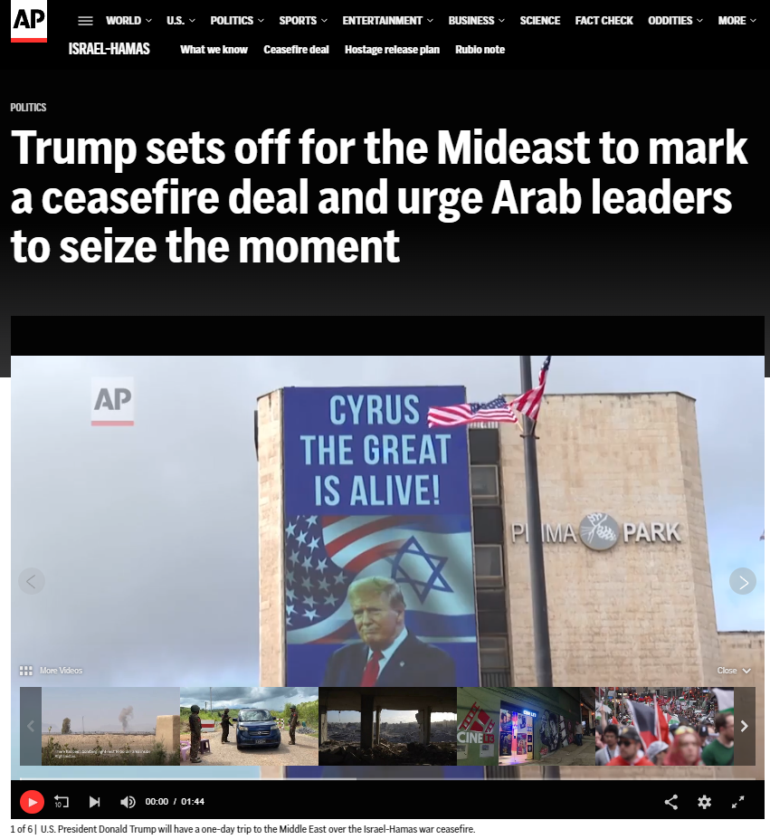 特朗普于当地时间9点左右抵达以色列,在以色列他只停留几个小时。在这短短的几个小时内,在受到以色列总统赫尔佐格、总理内塔尼亚胡的迎接后,特朗普将与得到释放的以色列被扣押人员家属会面,并在以色列议会发表演讲。