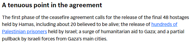 对于正在执行的加沙第一阶段停火协议,美联社的评价是“这是一份脆弱的停火协议”,因为并不清楚双方是否已经就加沙战后治理和重建以及以色列要求哈马斯解除武装的要求等关键因素达成协议。报道说,围绕这些问题的谈判可能会破裂,而且以色列暗示,如果其要求得不到满足,可能会“恢复在加沙地带的军事行动”。