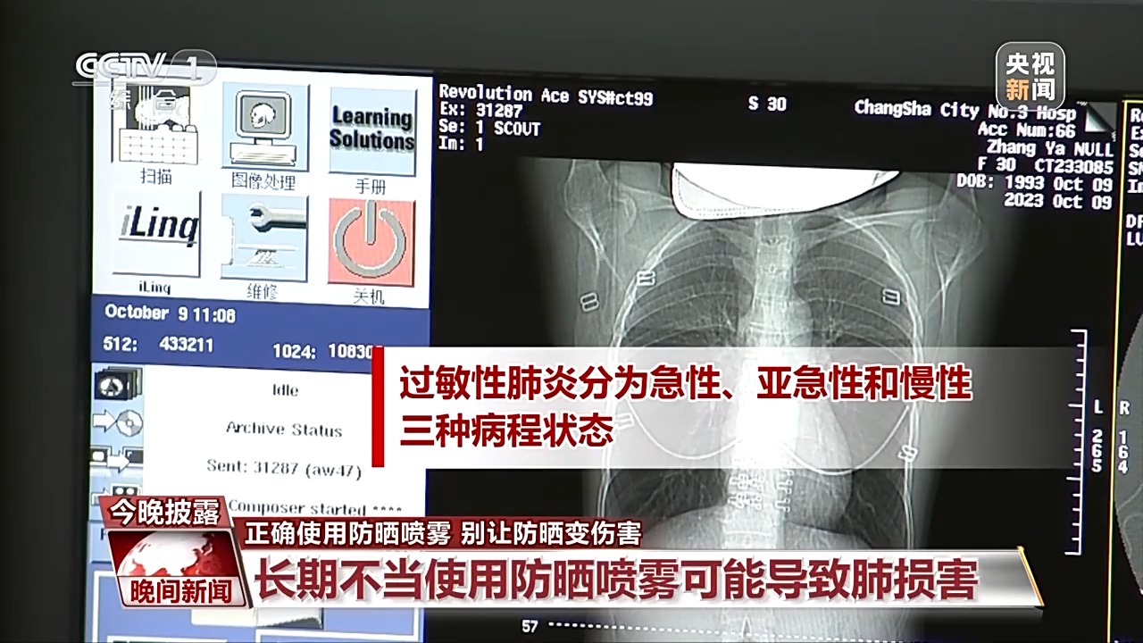 前不久,长沙市第三医院急诊科来了一位年轻患者,他因呼吸困难和咳嗽前来就诊。多维度CT检查发现,这位患者的双肺呈现大面积对称性的白色磨玻璃影,也就是我们俗称的白肺。患者自己叙述说,因为天气暴晒,他在出门前使用了防晒喷雾,是对着自己的脸部喷的,当时没有屏住呼吸,随后咳嗽持续了一天,大概九个小时以后,他已经感觉到呼吸非常困难了。医生表示,基本可确定是防晒喷雾吸入之后肺部发生了过敏性反应,引起了肺水肿的病变,从而导致了急性过敏性肺炎。