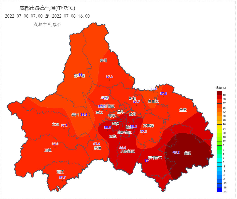 很多人都说,成都从来没有像今年这么热过。的确,成都国家气象观测站监测数据显示,7月6—7日是全市此轮高温天气的最高时段,新都站、都江堰站、简阳站最高气温突破建立气象站以来的历史极值,彭州站与历史最高气温持平。简阳国家气象观测站7月6日16时14分气温达到40.4℃,这个气温也成为了全成都新的极端最高气温。