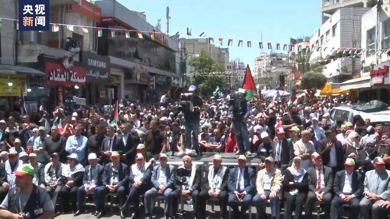 总台记者 赵兵:我身后不远处就是约旦河西岸城市拉姆安拉。当地时间15日上午,大批巴勒斯坦民众在市中心游行,纪念巴勒斯坦第75个“灾难日”,同时要求以色列结束对巴勒斯坦领土的占领,以及实现巴勒斯坦难民回归故土的权利。