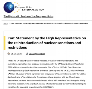 2025年8月28日,法、德、英三国正式通知安理会,认定伊朗“严重违反”协议承诺,触发该机制。依程序,若安理会未在30天内通过反对决议,制裁将自动恢复。尽管多国表达反对,安理会未能在9月27日截止期限内阻止这一进程。9月28日,欧盟对外行动署发布声明,宣布立即恢复所有此前解除的制裁;29日,欧盟理事会正式公报确认,一系列核相关限制性措施重新生效。