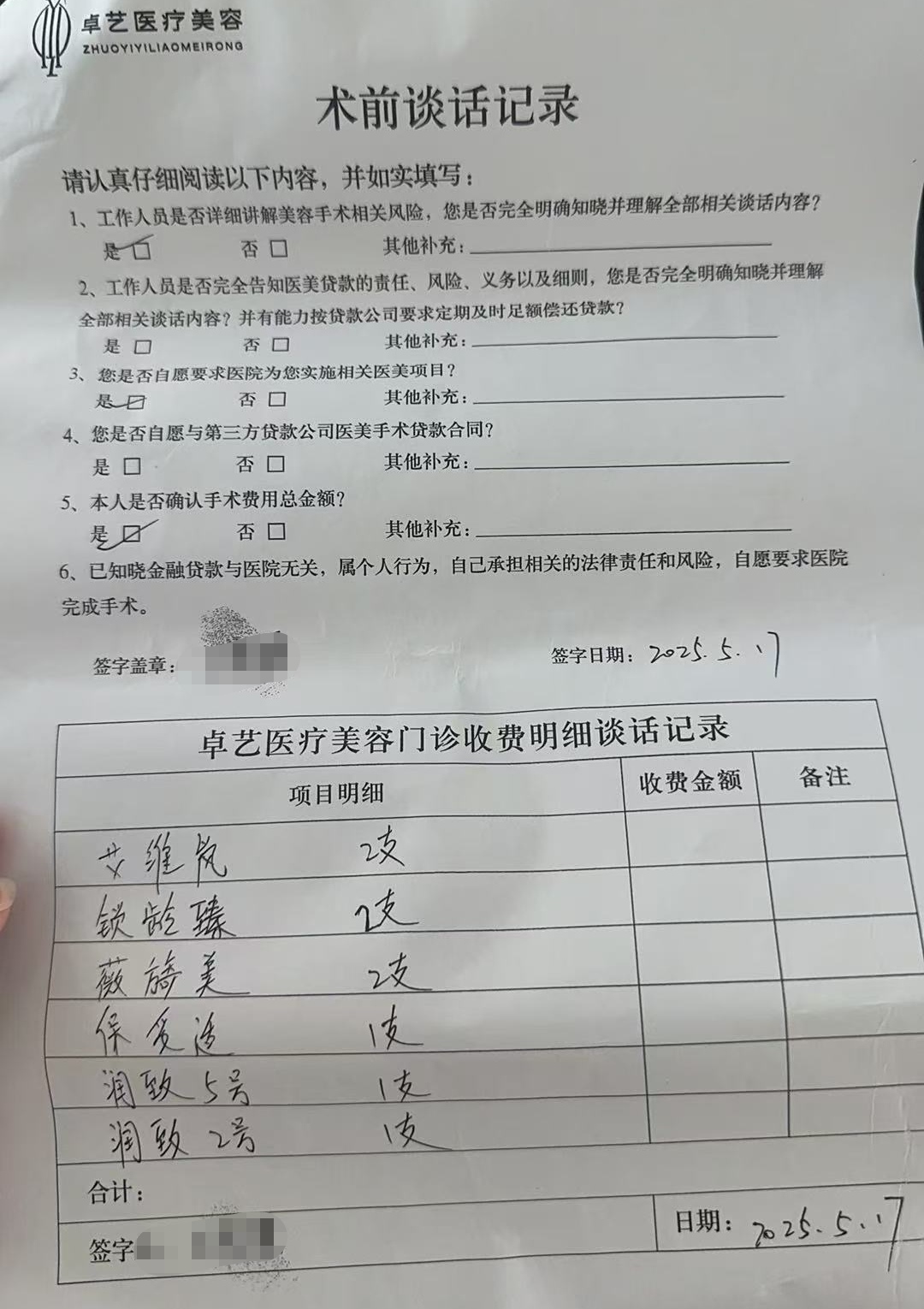 王女士向记者提供了两份材料,其中术前谈话记录中,她勾选了“确认手术费用”“自愿要求医院实施医美项目”“工作人员详细讲解了手术相关风险”。