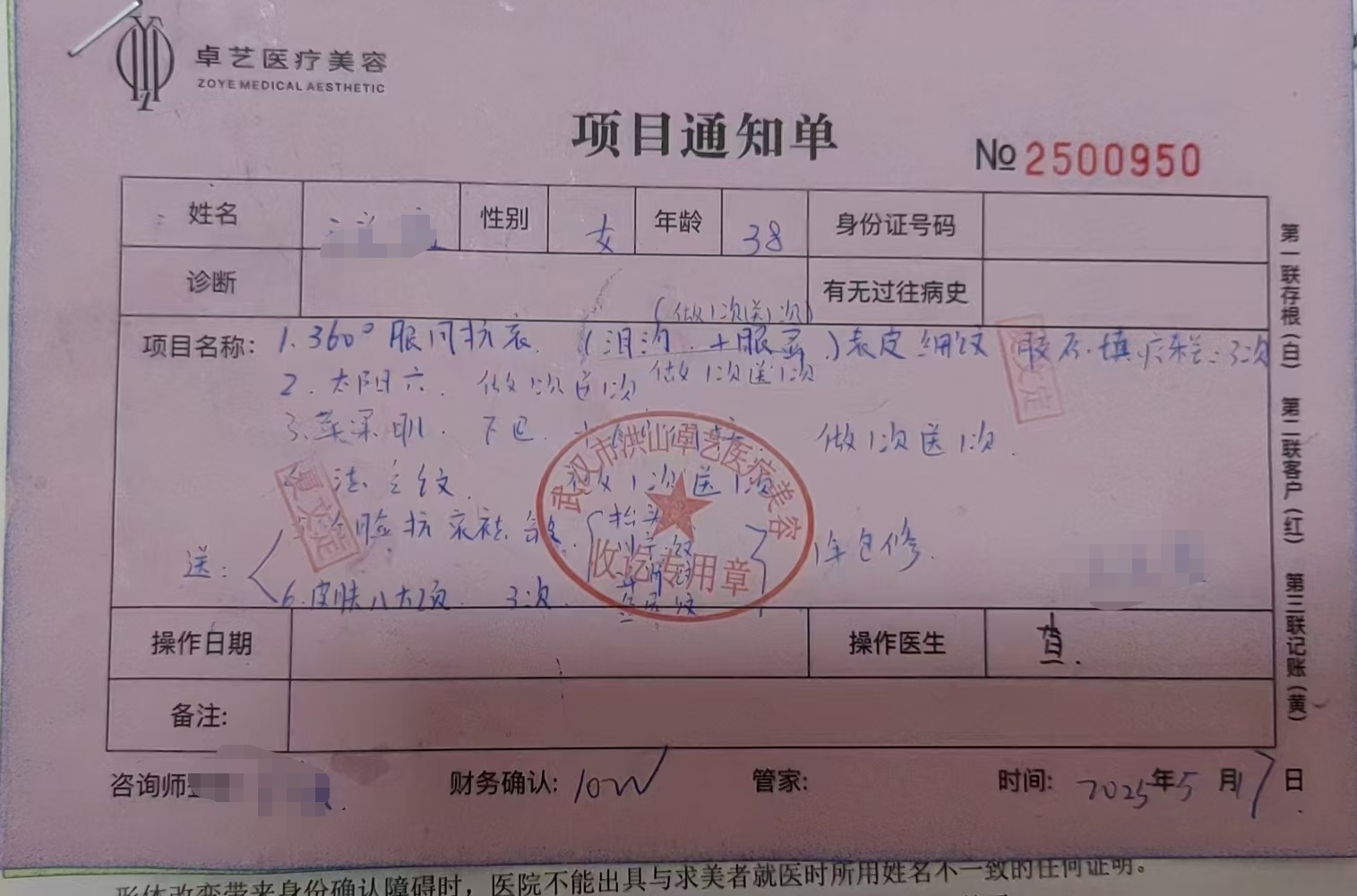 该负责人提供的收据清单中,手写的项目内容包括360度眼周抗衰、胶原填充疗程(3次),太阳穴和苹果肌(做1次送1次)、下巴、法令纹处理(做1次送1次)。另外赠送全脸抗衰祛皱、皮肤八大项(3次),1年包修。
