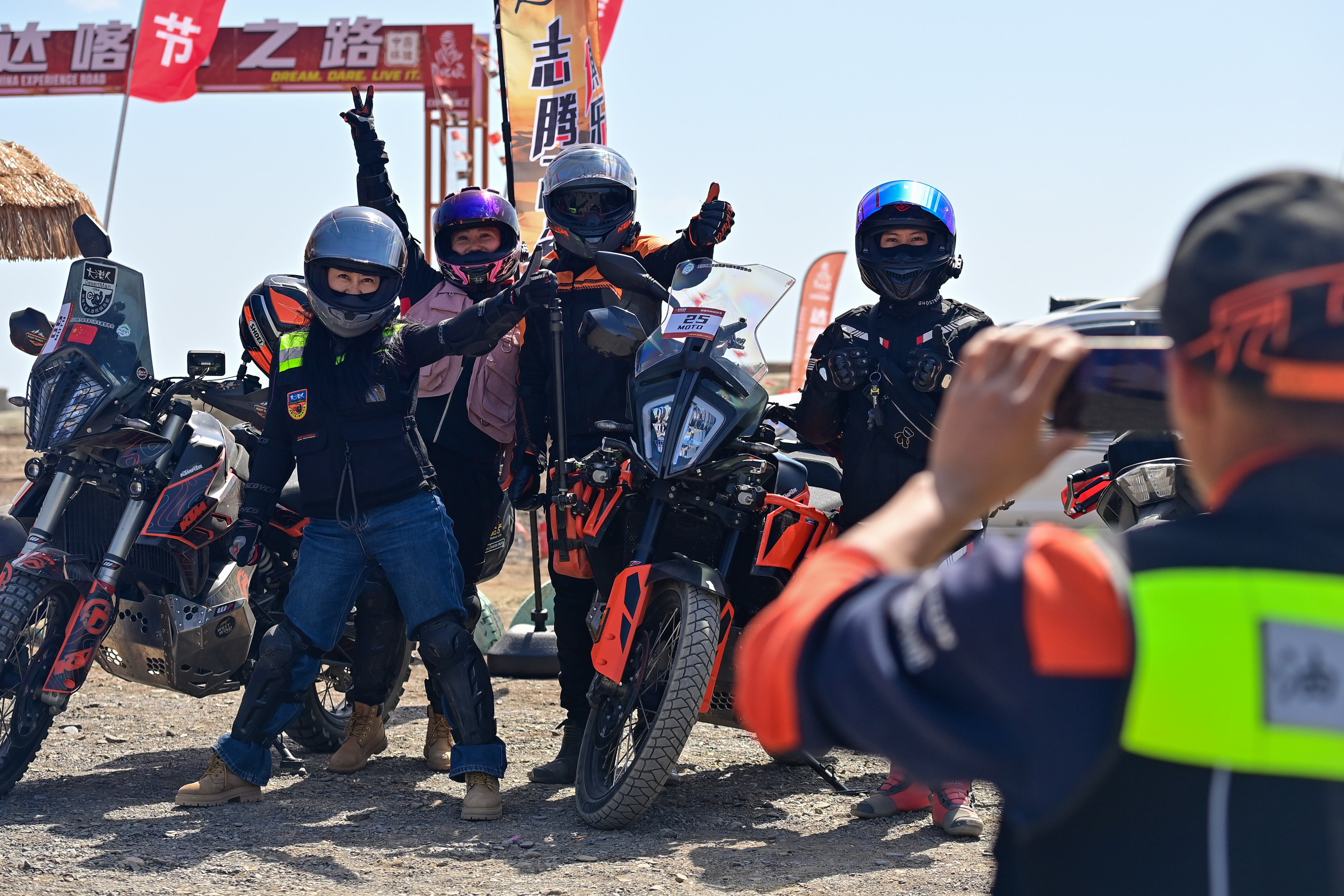 2024年5月1日,在新疆克拉玛依市乌尔禾区世界魔鬼城景区,车友在自驾线路起点合影。新华社记者 丁磊 摄