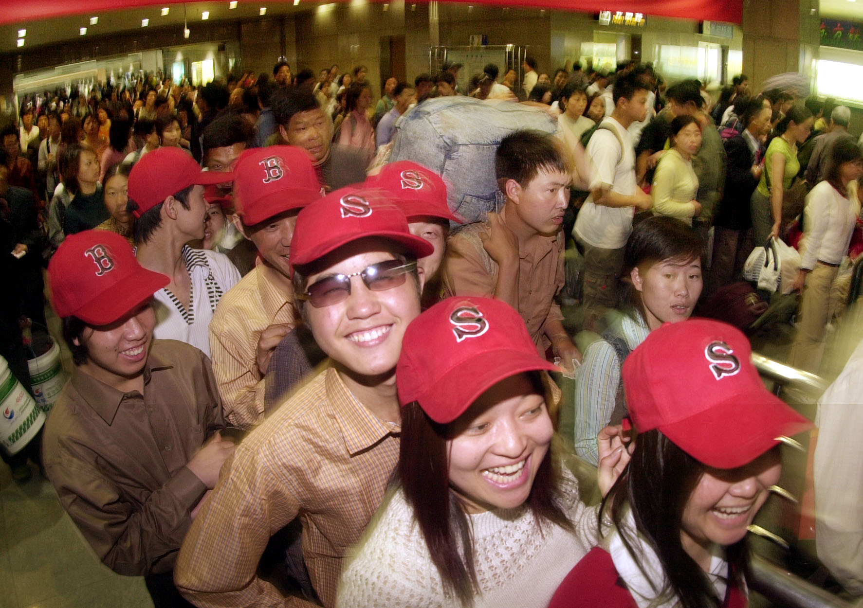 2004年5月1日,在杭州火车站出口处,大批旅行团游客准备出站。“五一”期间,来自全国各地的大批游人通过铁路和公路涌入杭州,形成旅游高峰。新华社发(李震宇 摄)
