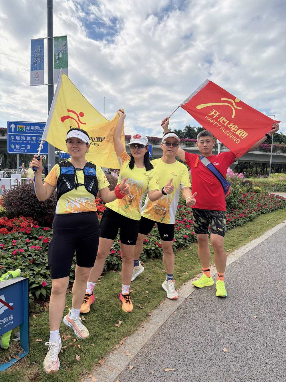 “开心纯跑”深圳湾队部分成员在马拉松比赛观赛区合影。受访者供图