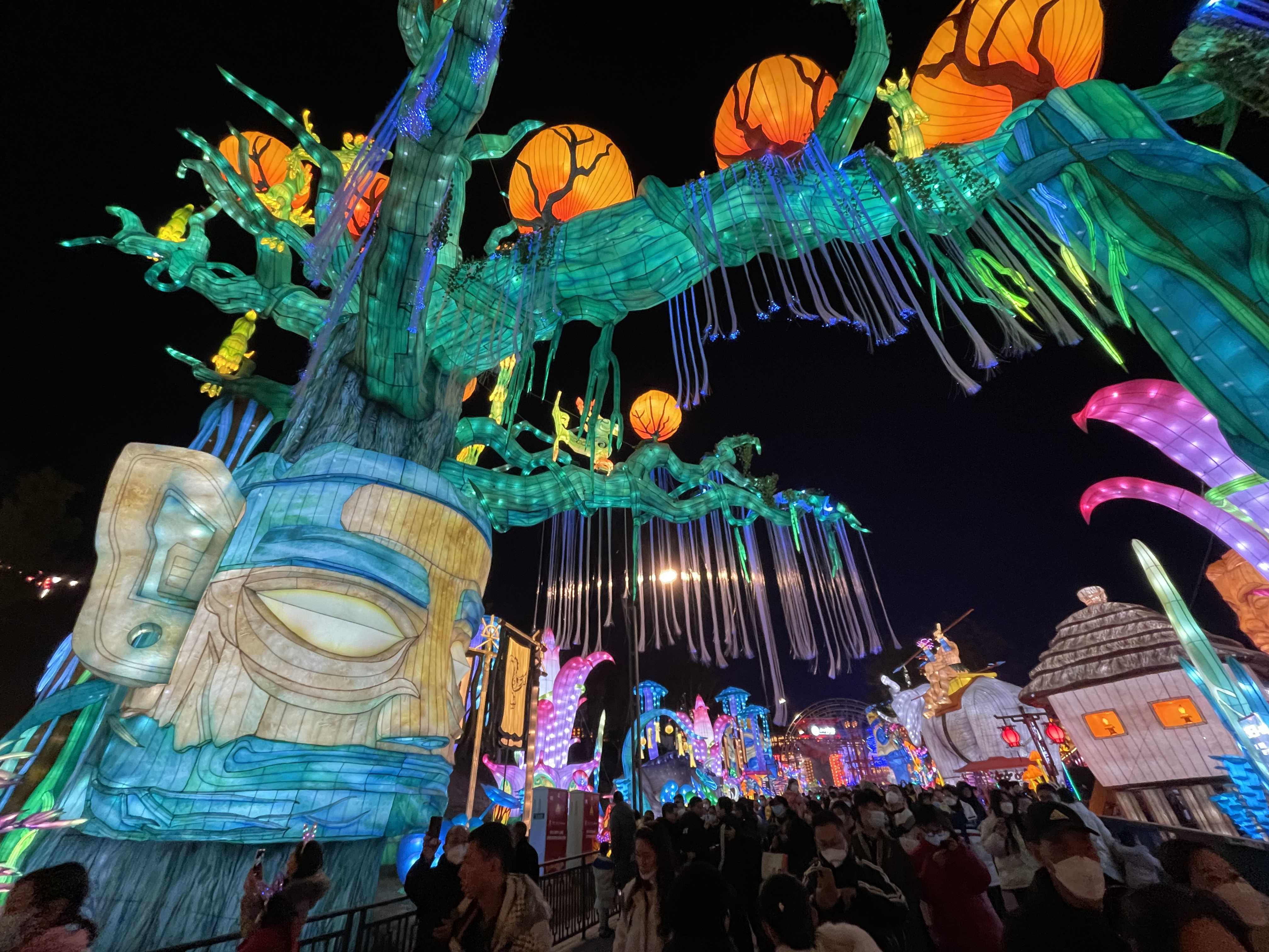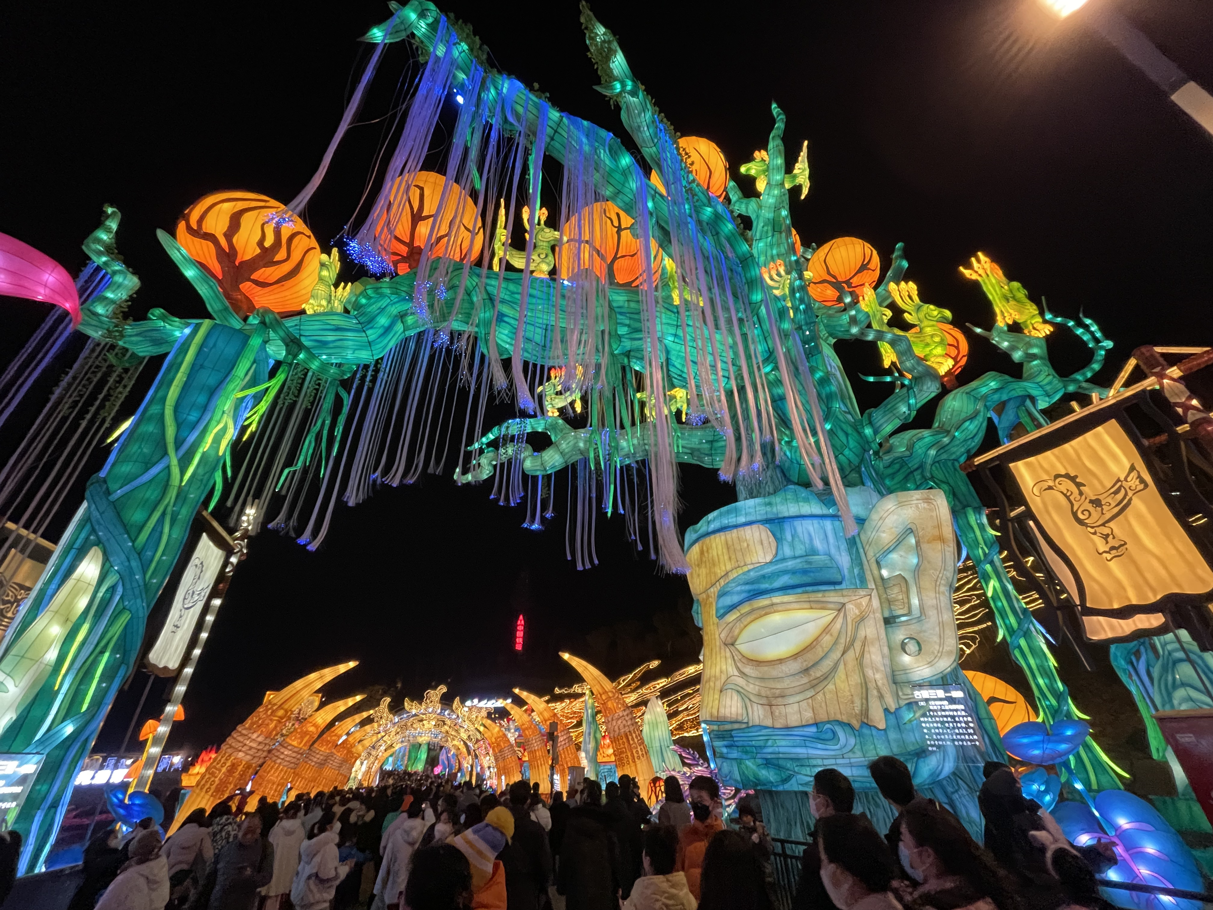 在《千灯博物馆》,一座三星堆面具为题材的灯组,矗立在路边,引人注目。“这是《古蜀三星》的《穿越》灯组,以金面罩铜人头像为核心,打造的一组‘三星堆面具’灯组。”曾杰介绍。