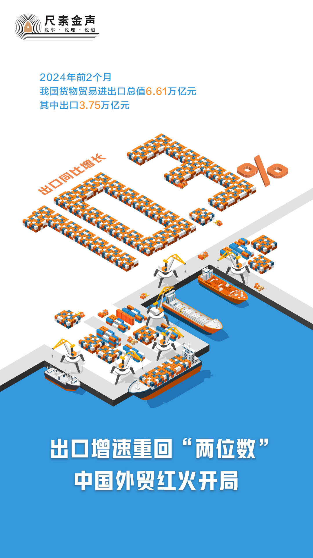 海关总署发布的数据显示,前2个月,我国货物贸易进出口总值6.61万亿元,同比增长8.7%。其中,出口3.75万亿元,同比增长10.3%。这是自去年4月份之后,我国出口增速重回“两位数”。