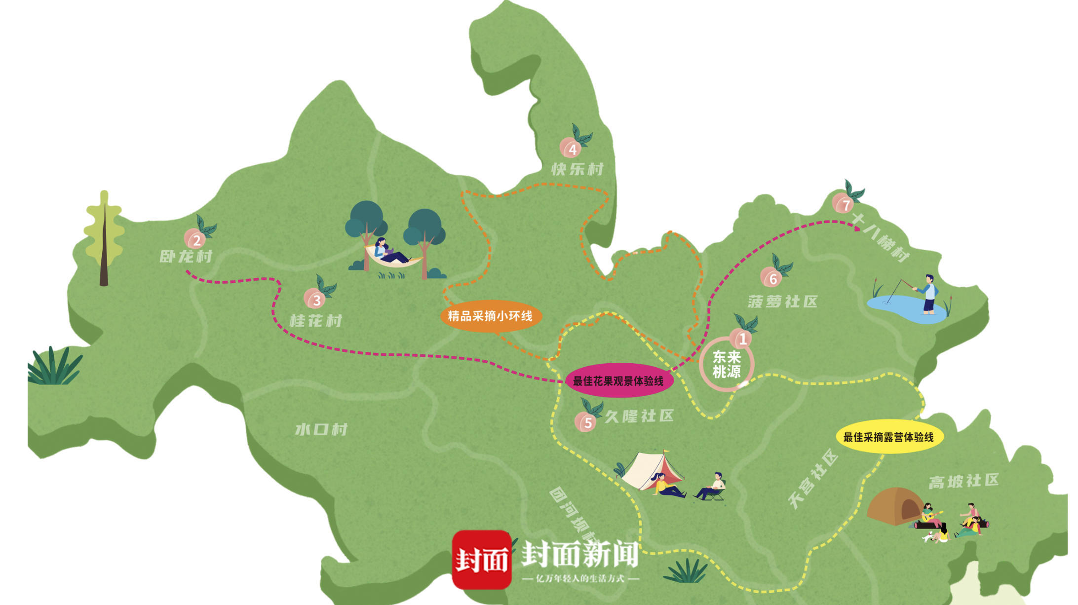 想要一边品尝蜜桃,一边感受露营,这条线路,不容错过。“最佳采摘露营体验线”以东来桃源为核心,贯通久隆社区新希望种子乐园以及高坡社区奇迹高坡生态露营区两大景区。