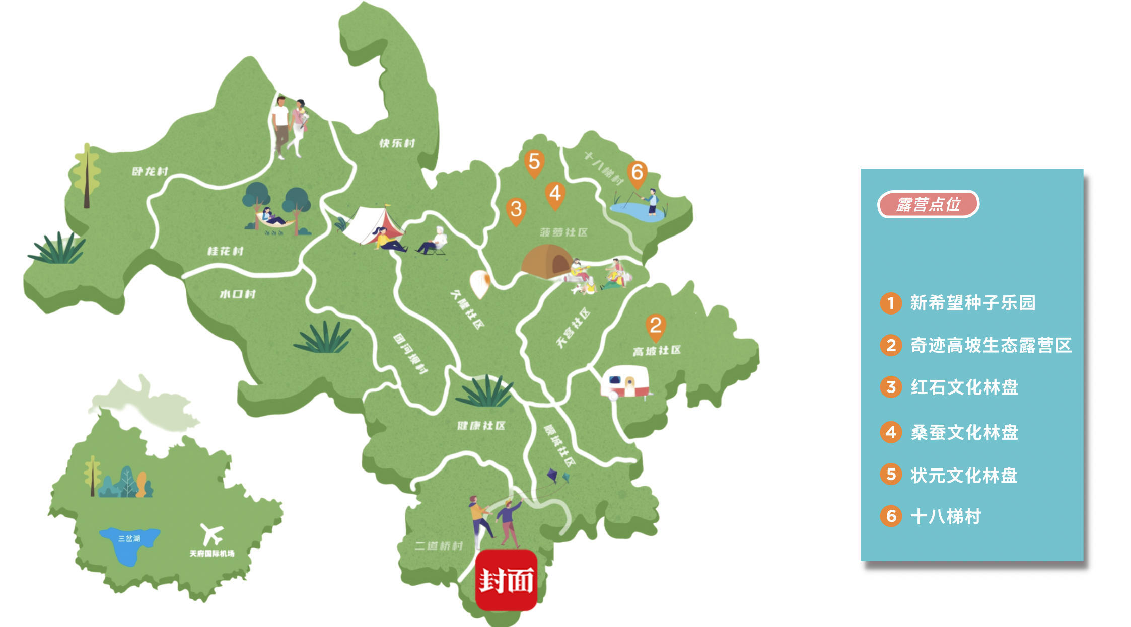 同时,红石文化林盘、桑蚕文化林盘、状元文化林盘和十八梯村也提供了露营点位。