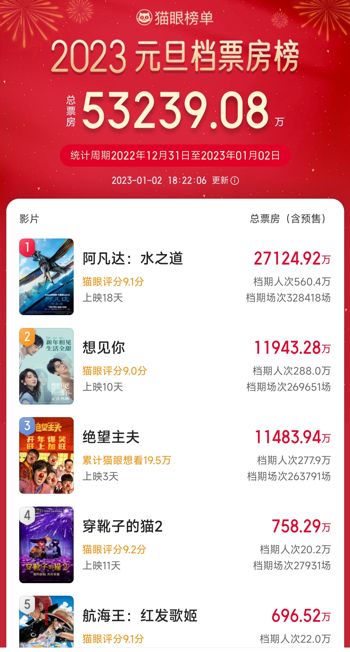 据猫眼专业版实时数据,截至1月2日18时08分,2023年元旦档(12月31日-1月2日)总票房达5.3亿元。档期票房冠军《阿凡达:水之道》吸金11亿。与此同时,全国影院营业数达10606家,营业率达84.3%,档期总场次99.7万,观影总人次1203.9万。