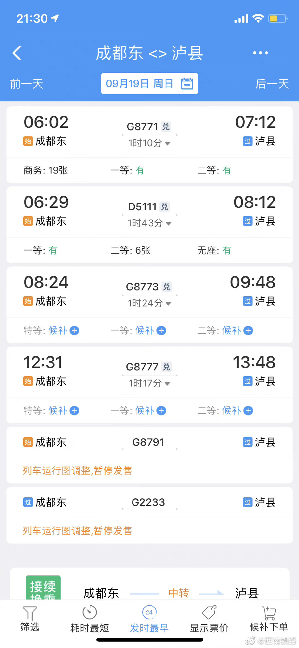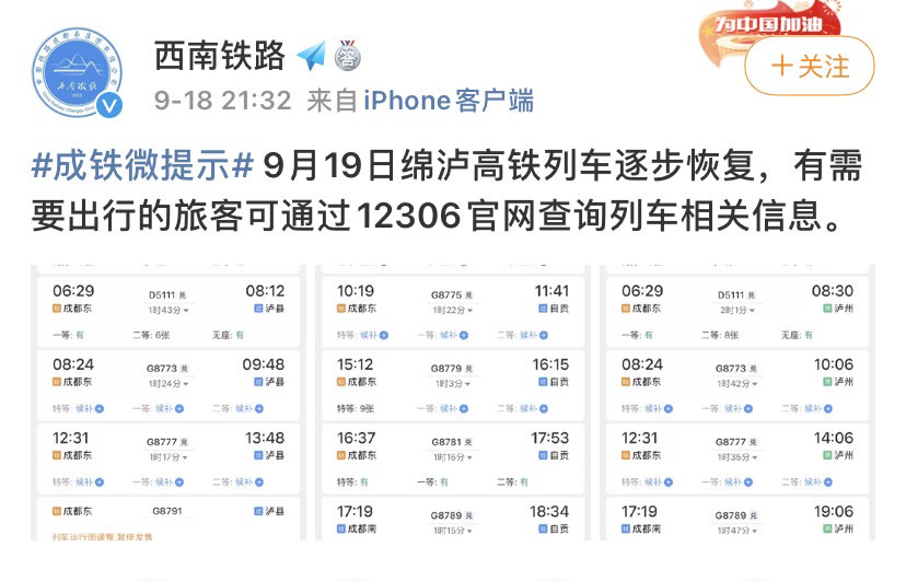 据西南铁路官方微博消息,9月19日,绵泸高铁列车逐步恢复,有需要出行的旅客可通过12306官网查询列车相关信息。