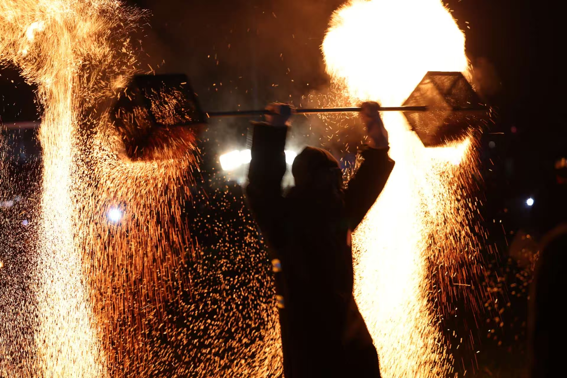 夜幕降临,火魔方、风火轮、火刀火棍等非遗火秀震撼登场,璀璨的打铁花与绚烂灯光秀交相辉映,篝火晚会的欢声笑语回荡在橘林上空,让游客沉浸式感受“烟火中国味”的独特魅力。