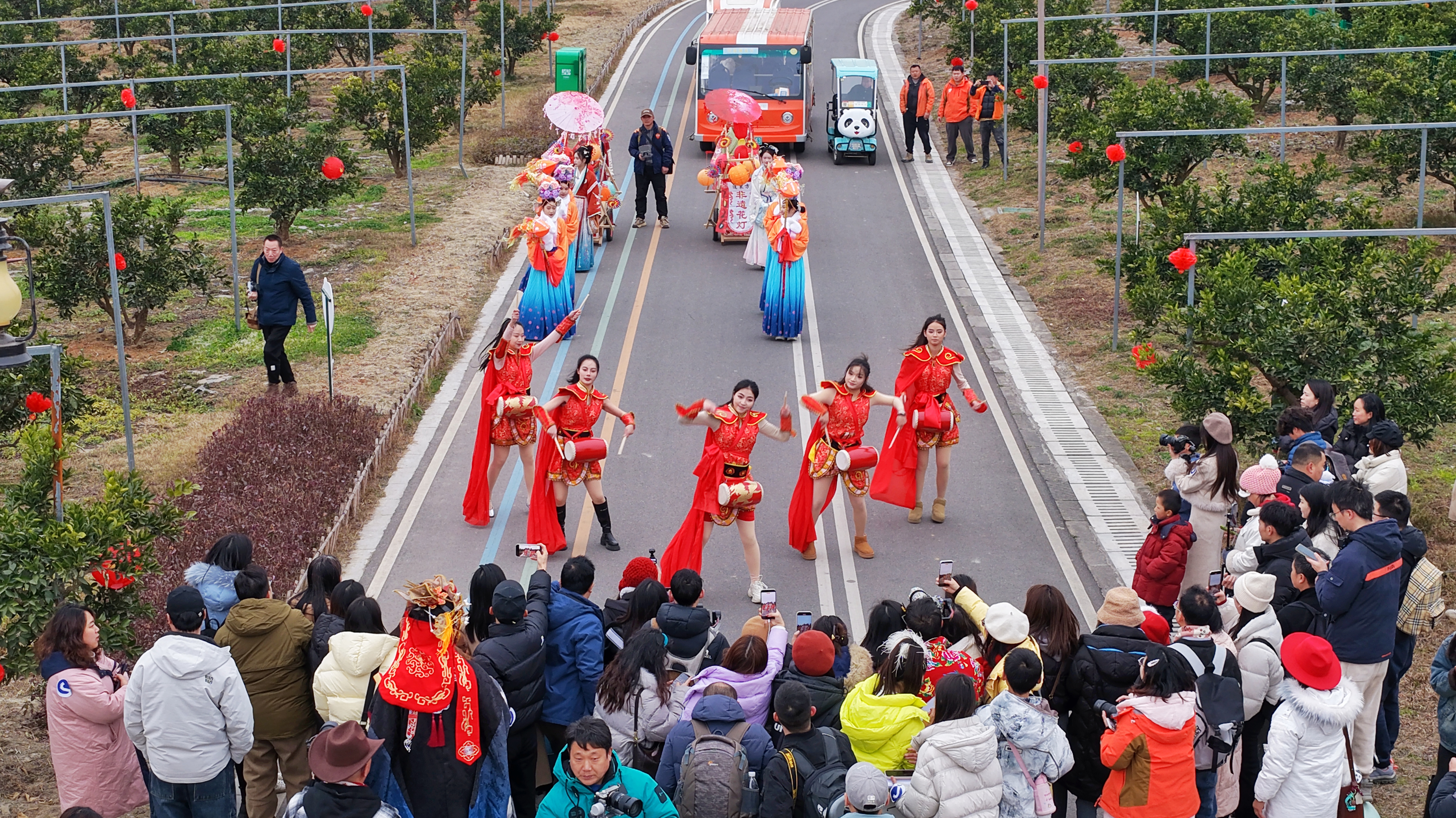 从游客中心到橘灯广场,五路财神巡游、威风锣鼓、金狮献瑞、鱼灯舞轮番上演,穿梭于橘林之间,与游客亲密互动送福纳祥,一路欢歌笑语让新春氛围拉满;橘灯广场主舞台上,财神快闪、红包派对、新派变脸吐火、醒狮街舞、汉唐古典舞《繁梦洛城》等节目精彩纷呈,传统非遗技艺与现代潮流元素碰撞出别样火花。