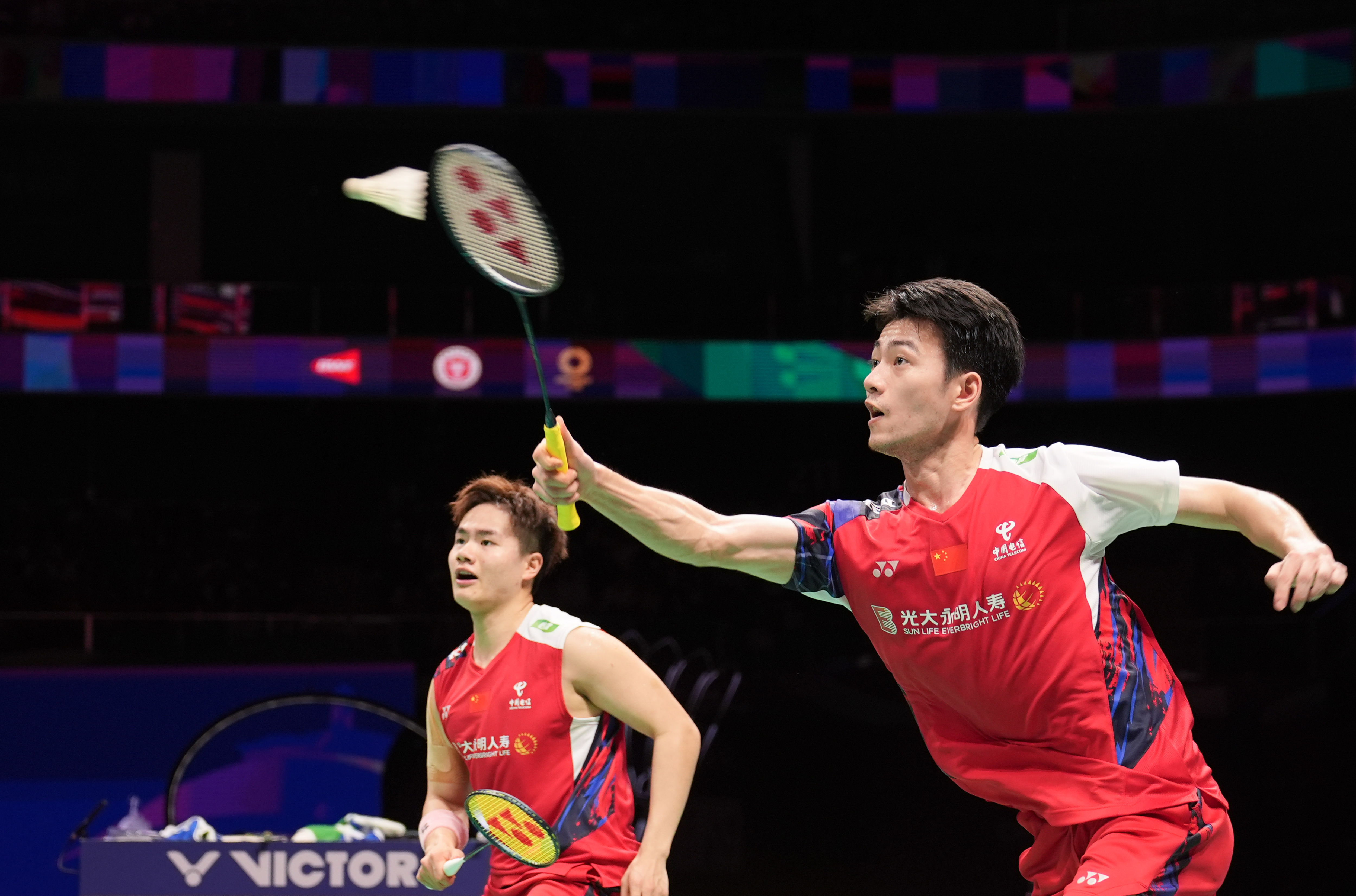 5月4日,中国队组合梁伟铿/王昶(右)在男子双打比赛中。新华社记者 江宏景 摄