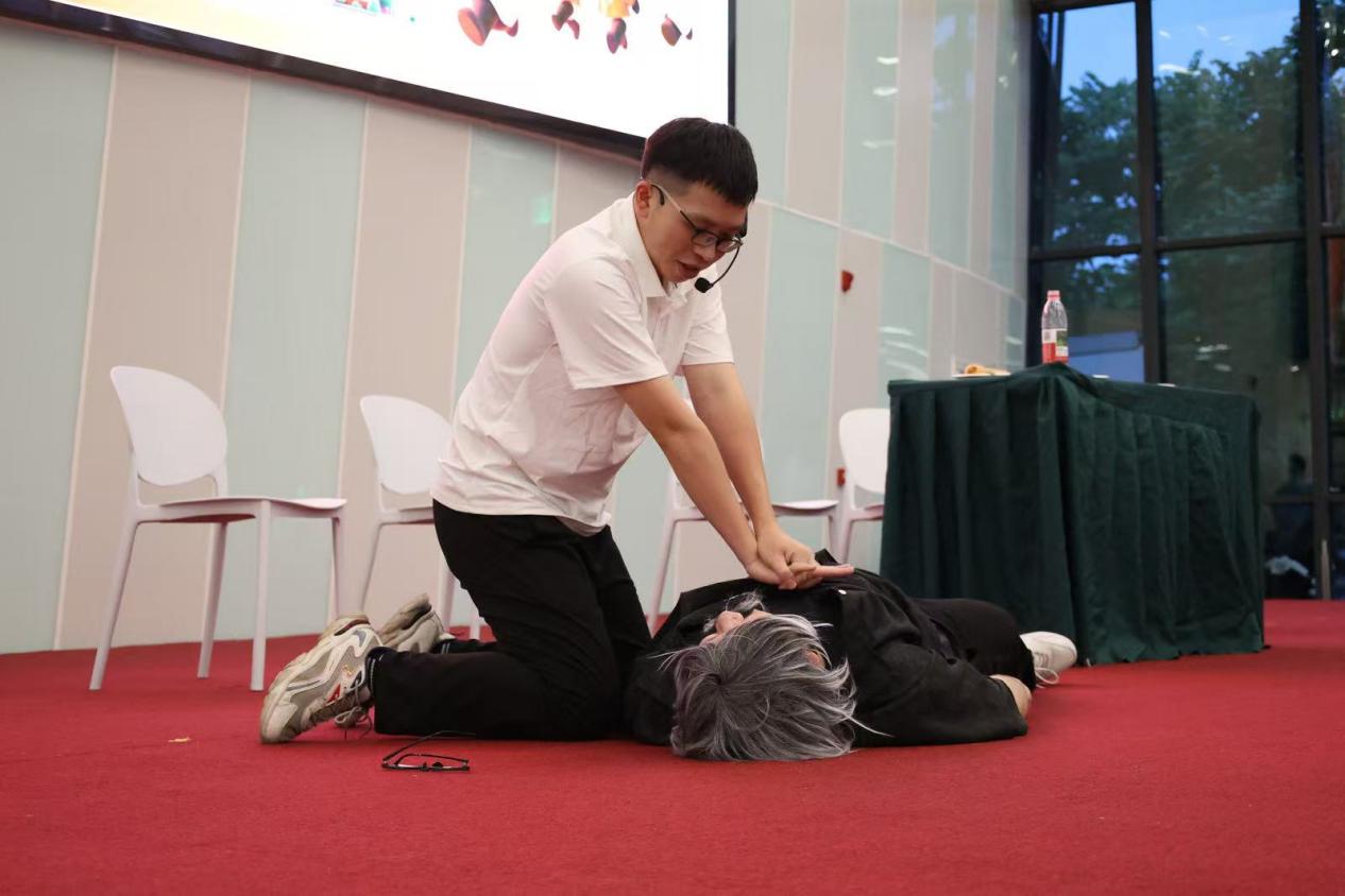 启动仪式后,一场精心编排的"家庭急救情景剧"拉开了培训序幕。培训以一段贴近家庭生活的情景剧开场,真实再现了儿童进食坚果窒息、老人噎食等常见突发状况。剧情清晰展示了从发现异常、判断情况,到实施海姆立克急救法、拨打120、使用AED设备以及持续进行心肺复苏(CPR)的全流程。通俗易懂的演绎,让观众迅速理解并掌握了关键急救步骤。没有难懂的术语,只有实打实的操作,让大家看得明白、学得会,关键时刻真能派上用场。