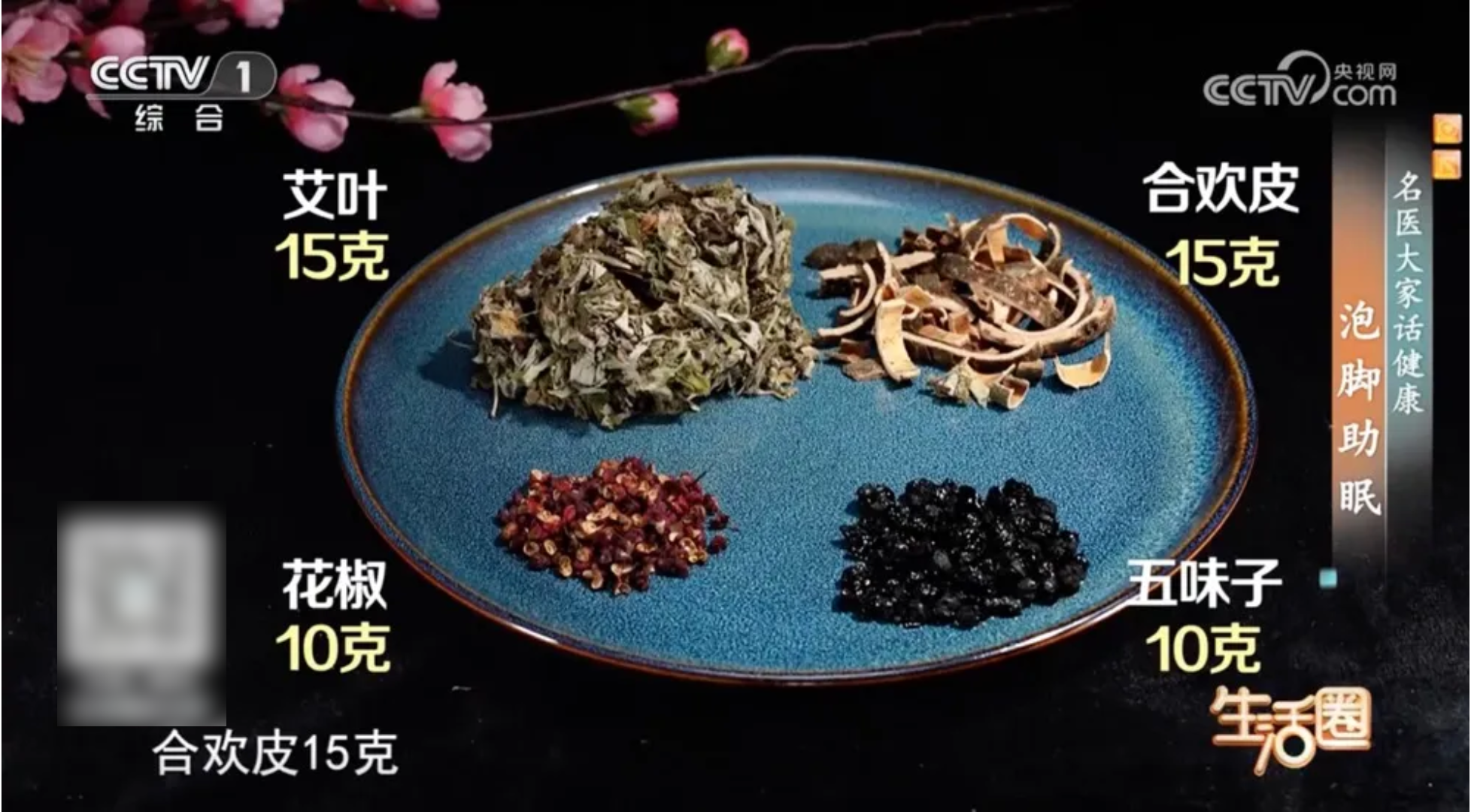 取花椒10g、艾叶15g、合欢皮15g、五味子10g,用纱布包好煮15分钟。取汁兑入40℃温水并没过脚踝,泡20分钟即可。小提示,中老年人应避免大汗,以身体微热、背部微汗为佳。