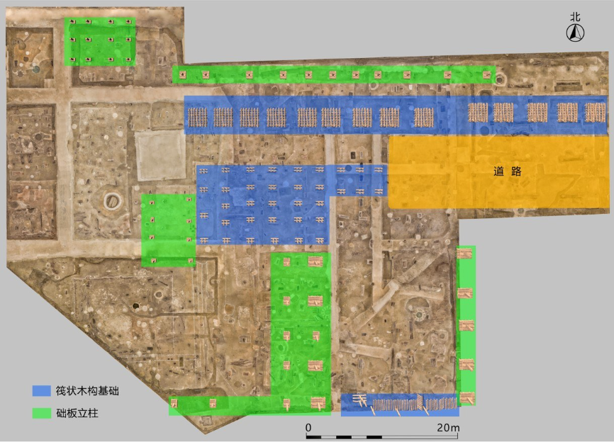在稽中发掘区,深埋地下6米处,一片宫台建筑基址显现。宫台建筑基址主要由筏状木构基础和础板立柱两种结构构成,筏状木构基础由多层圆木横纵相间、叠压铺设,间隔分布,如同一个巨大的木筏。“这种筏状木构基础在越国考古中系首次发现。”绍兴市文物考古研究所所长李龙彬说。这种营建方式,为在南方湿地环境中加固地基、防止沉降的科学方法,是古代南方传统干栏式建筑与中原台基式建筑技术的完美融合。