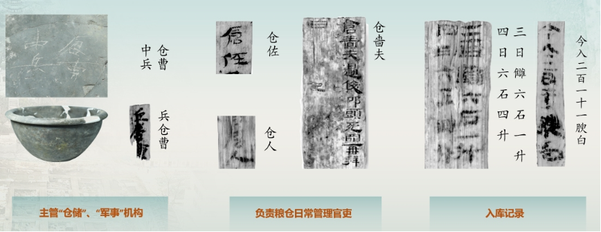 在汉六朝时期的多个遗迹单位和多种器物类型上方发现文字涉及古代“仓库”官署、官职、工作记录等。据东汉《越绝书》卷八:“句践小城,山阴城也。周二里二百二十三步,陆门四,水门一。今仓库是其宫台处也”的记载,遗址汉六朝时期存在与军事和粮食储备相关的仓库,进一步确认稽中地点发现的东周时期高等级建筑为越国宫台。