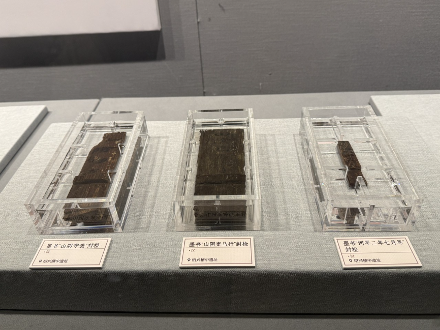 “浙里寻珍——2025年度考古成果展”上,来自绍兴稽中遗址的汉代封检。记者 林婧 摄