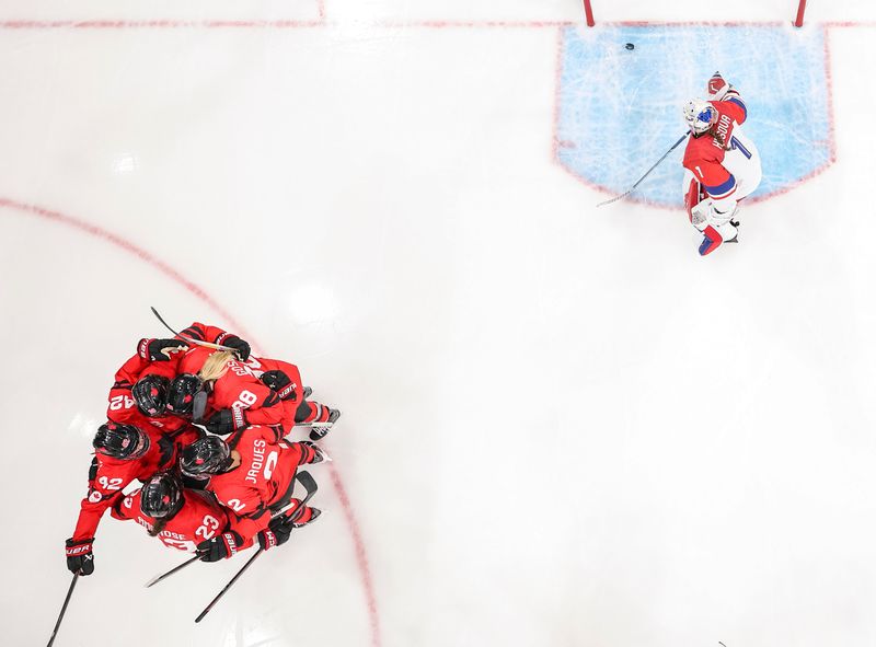 加拿大女子冰球队球员在比赛中庆祝得分(新华社)