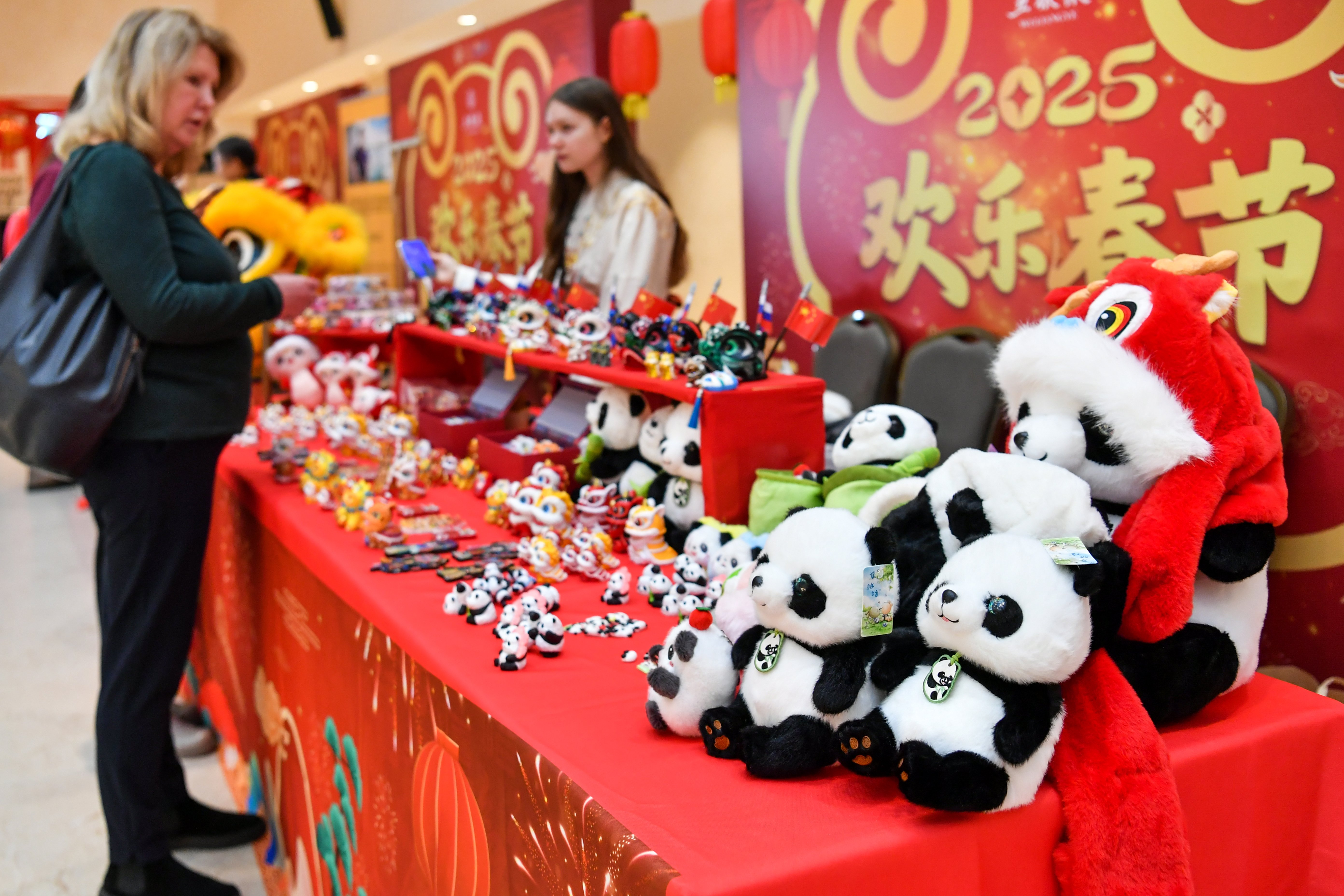 2025年1月28日在俄罗斯莫斯科举行的新春庙会活动上拍摄的文创产品。 2025年10月18日,以“文明重光:文化遗产与人类文化多样性”为主题的第三届“良渚论坛”在浙江省杭州市开幕。 2025年8月22日,在瑞士伯尔尼中国文化中心,嘉宾在由该中心与恭王府博物馆联合主办的“安善萃锦——中式生活美学展”开幕式上体验制作扇子。 2024年7月5日,在泰国曼谷的泡泡玛特店内,一名女子在拉布布玩偶前自拍。