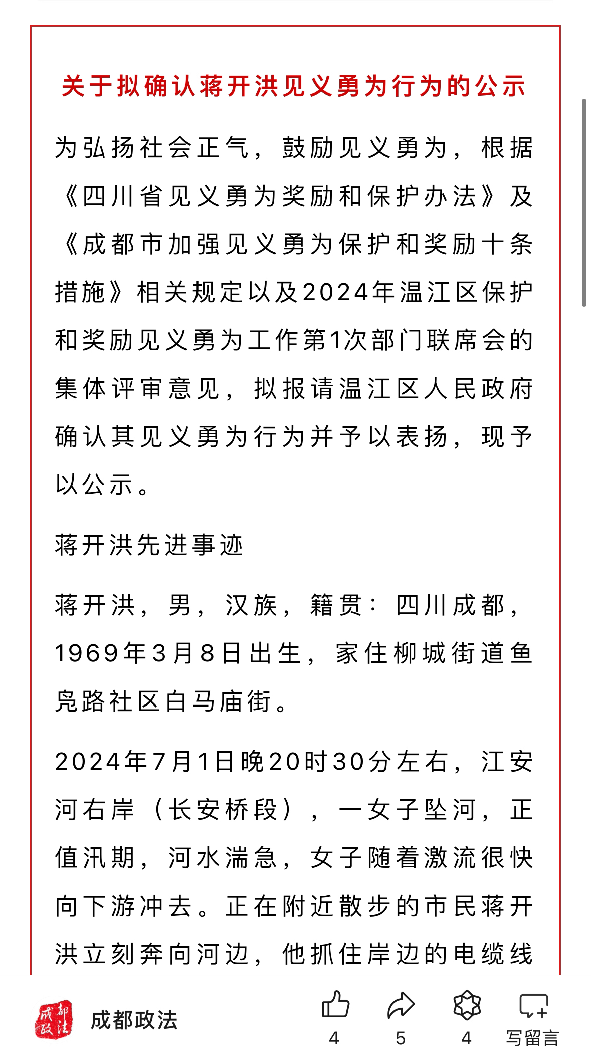 7月5日,记者从成都市委政法委获悉,根据《四川省见义勇为奖励和保护办法》及《成都市加强见义勇为保护和奖励十条措施》相关规定以及2024年温江区保护和奖励见义勇为工作第1次部门联席会的集体评审意见,拟报请温江区人民政府确认其见义勇为行为并予以表扬,现予以公示。