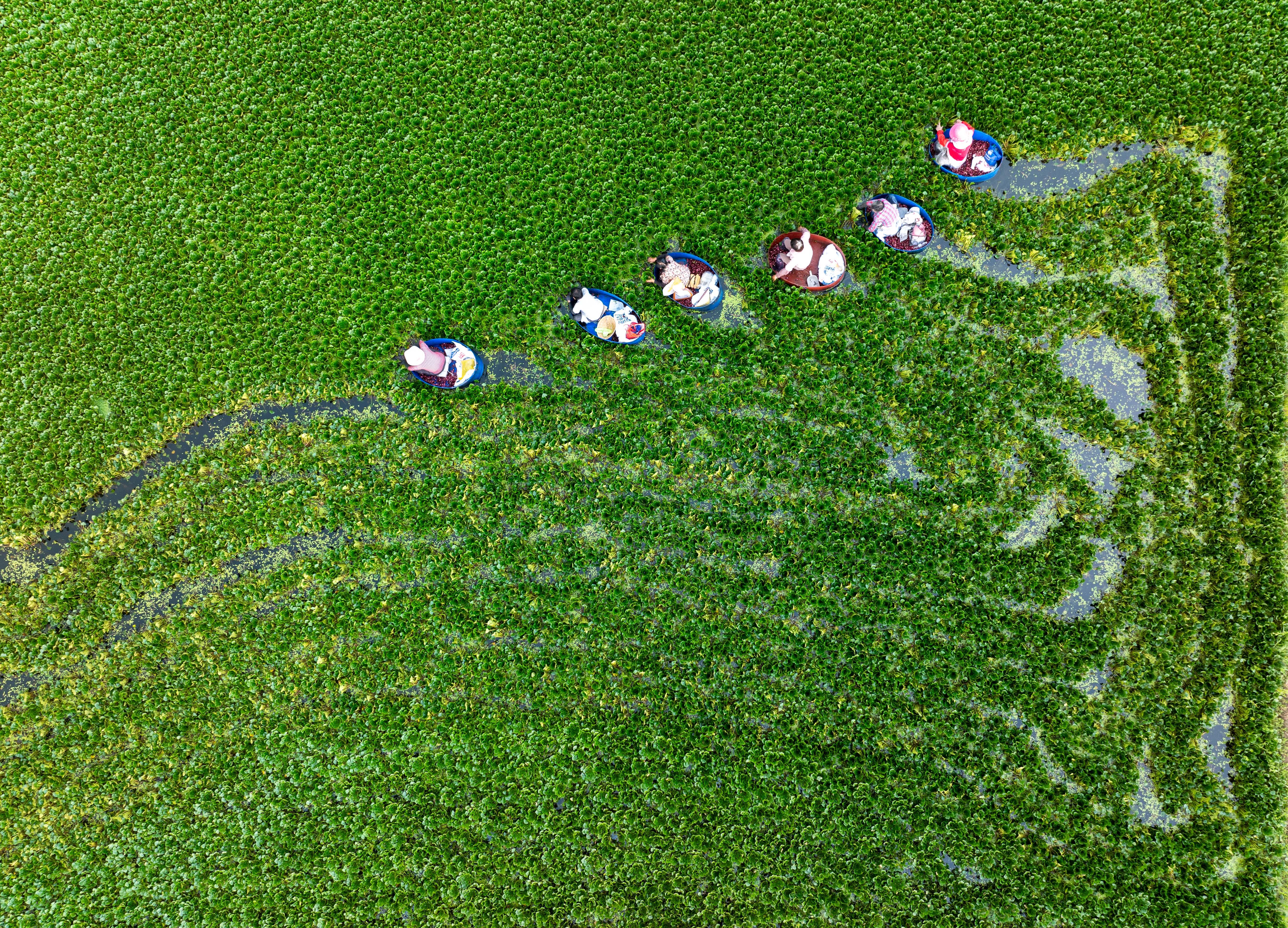 △2024年8月7日,江苏淮安市洪泽区岔河镇的村民采收菱角。近年来,当地利用白马湖优质水域生态为依托,带动当地农民增收致富,助力乡村振兴。