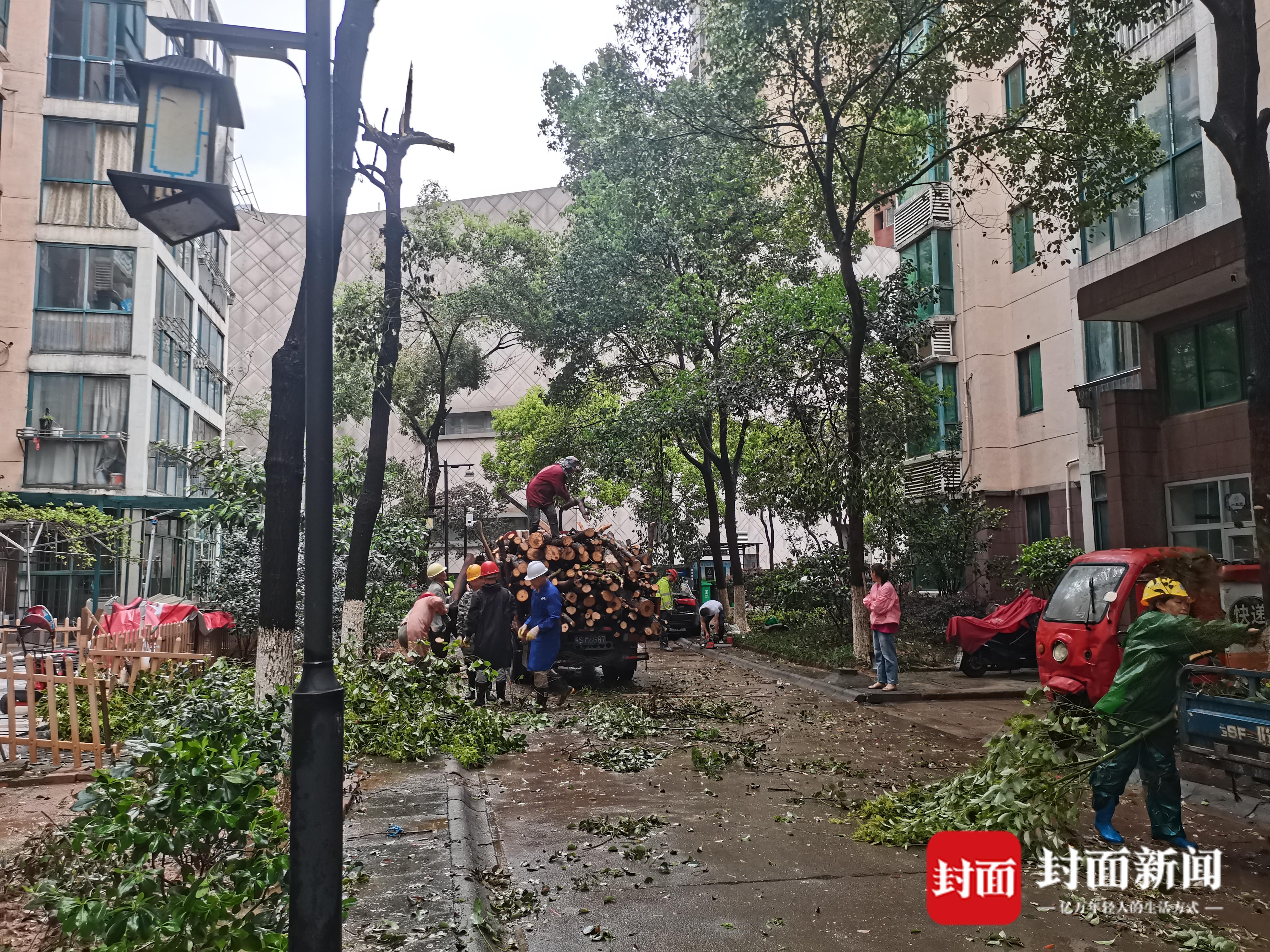 记者在小区看到,矮层建筑区有大量的樟树被折断树枝,还有一些碗口粗的树出现倒伏。工人们操控着油锯清理,截断的木头装满了一辆卡车。
