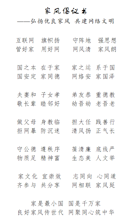 这四个家庭是网络文明建设领域代表家庭,他们展现了新时代家庭家教家风建设推动网络文明建设的生动实践和显著成效,推动网络文明建设高质量发展。节目的最后,大家一起诵读“家风倡议”,以“三字经”形式向社会发出“弘扬优良家风 共建网络文明”的倡议。