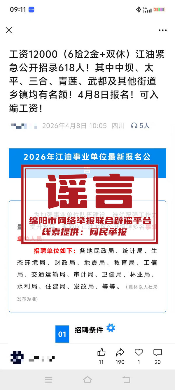 4月8日,网民米某某在微信公众号发布题为“工资12000(6险2金+双休)江油紧急公开招录618人!其中中坝、太平、三合、青莲、武都及其他街道乡镇均有名额!4月8日报名!可入编工资!”的帖文,引发部分网民关注讨论。经江油市人力资源和社会保障局核实,江油市并无相关招录计划,该消息纯属谣言。