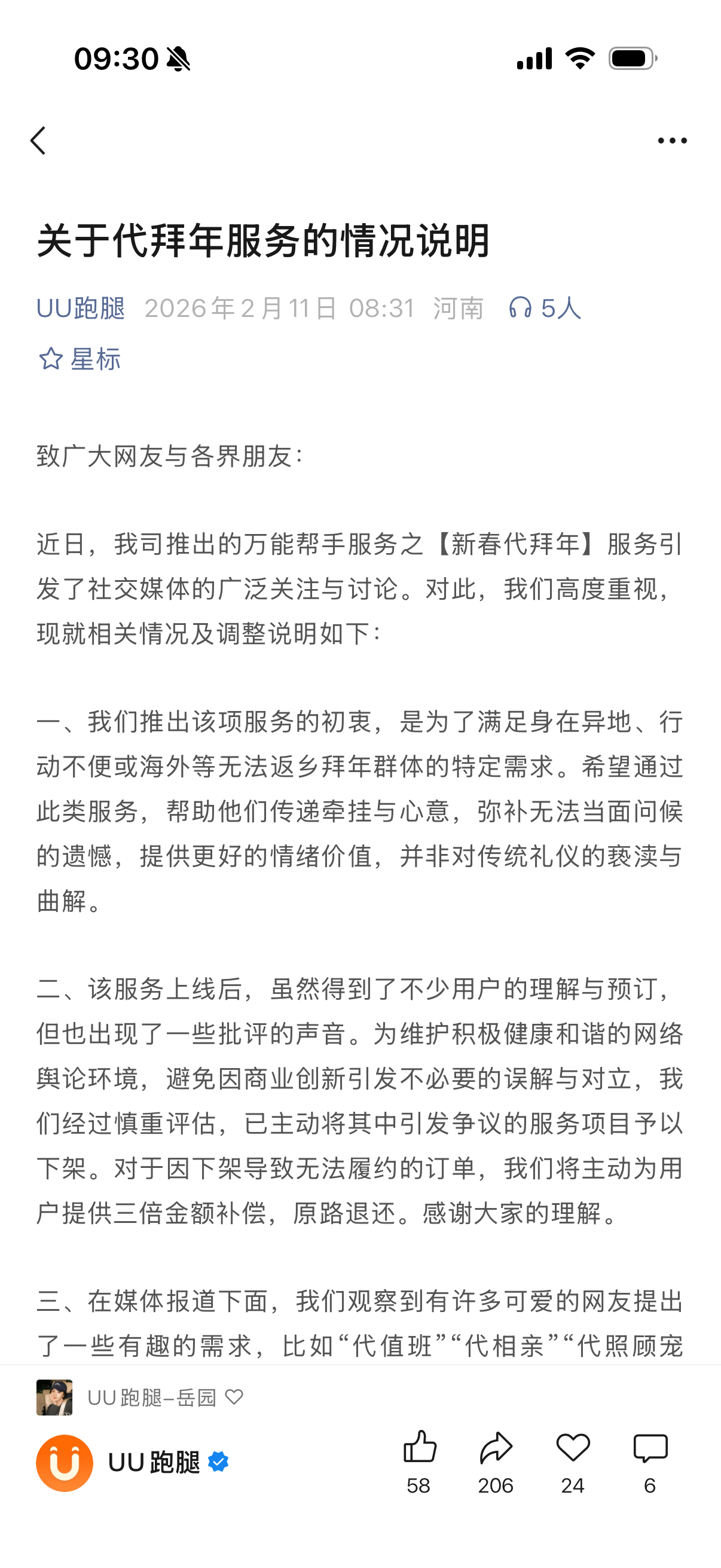 2月11日,UU跑腿发布关于代拜年服务的情况说明。UU跑腿表示,推出该项服务的初衷,是为了满足身在异地、行动不便或海外等无法返乡拜年群体的特定需求,并非对传统礼仪的亵渎与曲解。经过慎重评估,已主动将其中引发争议的服务项目予以下架。对于因下架导致无法履约的订单,将主动为用户提供三倍金额补偿,原路退还。“代值班”“代相亲”“代照顾宠物”“换班照顾医院老人”等服务将在评估后尽快研究上架,帮助更多有需求的用户。